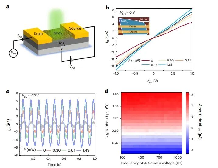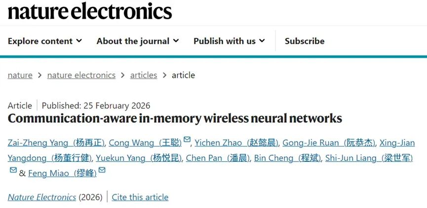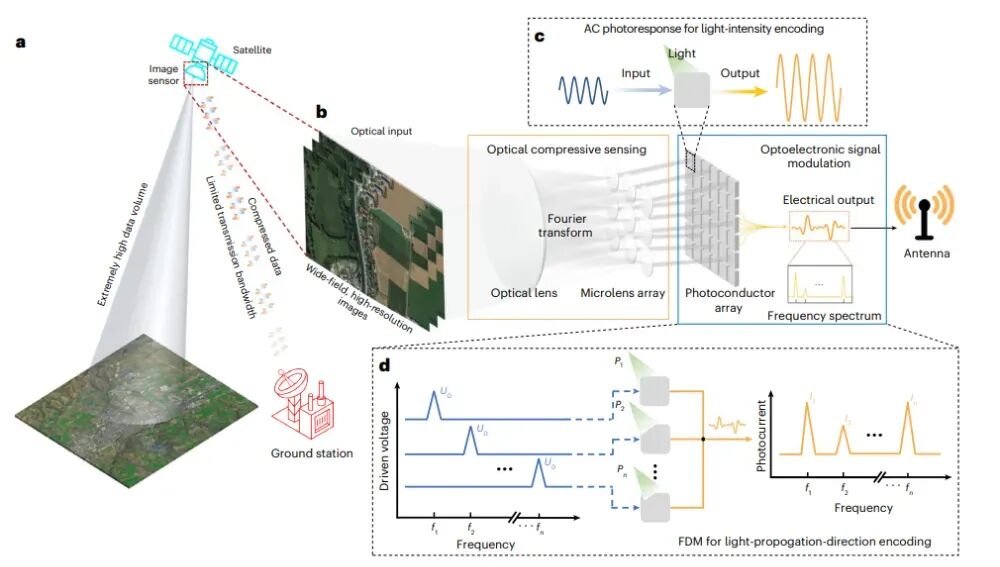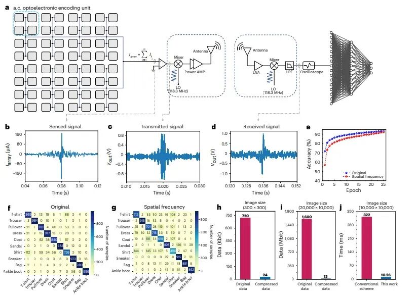 继2026年2月底在《Nature Electronics》发表通信感知型存算一体无线神经网络的突破性成果后,南京大学缪峰教授、梁世军教授、杨悦昆副教授领衔的团队提出基于二硫化钼(MoS₂)光电晶体管阵列的传感器内无线计算架构,搭建包含发射端(编码、载波调制、功率放大)和接收端(低噪声放大、相干解调、滤波)的完整硬件系统,验证了该架构在图像识别精度、压缩比、延迟及鲁棒性方面的核心性能,同时通过仿真证明其在超高分辨率成像和带噪信道传输中的可扩展性。以“In-sensor wireless computing for intelligent remote sensing”为题发表在《Nature Sensors》,一个月内连续斩获两篇大《Nature》子刊。通过直观示意图清晰对比了传统遥感架构与新型架构的核心差异,左侧揭示了传统架构需逐像素数模转换、延迟随图像尺寸平方增长的固有局限,中间呈现了传感器内无线计算的一体化流程——借助光学傅里叶变换和微透镜阵列实现硬件级图像压缩,同步捕获空间频率的振幅与相位信息,再通过光电信号调制直接转化为可无线传输的电信号,右侧则阐明了基于交流光响应和频分复用的编码机制,即光强编码为交流光电流振幅、光传播方向编码为不同驱动频率,完整呈现了“成像-压缩-调制-传输”融合为单一步骤的核心设计逻辑。图2:直流和交流驱动电压下MoS₂光电晶体管的光响应特性进一步表征了MoS₂光电晶体管的核心性能:展示了器件的结构与光学显微镜图像,通过直流驱动下的IDS-VDS曲线验证了光电流随光强增加的光电导效应;通过交流驱动下的IDS-时间曲线和振幅映射图,证实光电流振幅仅由光强调制、与驱动频率无关,且波形与驱动电压保持一致,为频分复用编码提供了关键性能支撑。图3:基于MoS₂光电晶体管阵列的传感器内无线信号调制该图聚焦2×2MoS₂光电晶体管组成的交流光电编码单元,通过实验验证了信号调制功能:当光斑照射单元内不同位置(对应不同相位梯度)时,单元输出信号的时域波形呈现明显差异,经傅里叶变换后的频域图谱中,峰值频率与被照射器件的驱动频率完全一致,证明该阵列可同步编码光强(振幅总和)和光传播方向(峰值频率)两类空间频率信息。图中展示了硬件系统的完整实现与性能验证结果:呈现了发射端、传输链路与接收端的架构设计,通过实测信号波形证实了编码、调制、传输与解调的有效性;基于FashionMNIST数据集的测试显示,接收端基于压缩空间频率信息的识别精度与原始图像相当,混淆矩阵进一步验证了识别的稳定性;数据对比表明,该架构实现了30:1的压缩比,对10000×10000像素图像的传输延迟仅10.26ms,较传统架构降低96.8%,且数据量大幅缩减。该研究创新性地提出传感器内无线计算架构,通过MoS₂光电晶体管阵列的交流光响应特性,实现了成像、压缩、调制与传输的一体化,在保证识别精度的前提下,大幅降低了遥感成像的传输延迟并提升了压缩比,同时在超高分辨率成像、带噪信道传输等场景中展现出优异的可扩展性和鲁棒性。这项工作不仅突破了传统遥感架构的固有局限,更为下一代低延迟智能遥感、星地网络通信及边云协同计算提供了全新技术路径,具有重要的理论价值与应用前景。