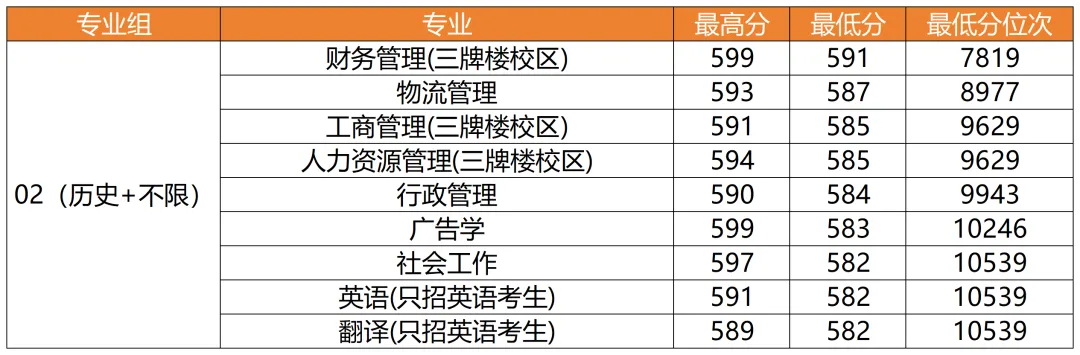 2. 英语(只招英语考生)—10539;3. 翻译(只招英语考生)—10539。最高录取位次专业为财务管理(三牌楼校区),录取位次7819;