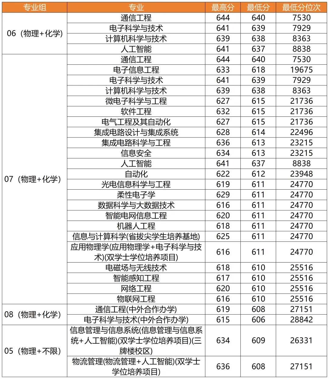 录取位次最低的前三专业:1. 电子科学与技术(中外合作办学)—28842;2. 通信工程(中外合作办学)—27151;3.物流管理(物流管理+人工智能)(双学士学位培养项目)—27151。