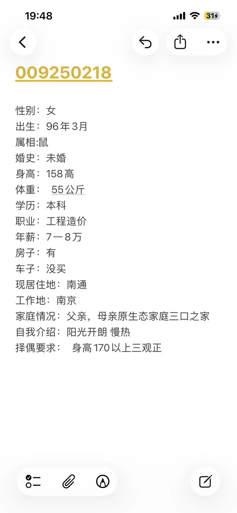 >南京脱单|96年,女,身高158,工程造价工作,本科学历,老家南通
