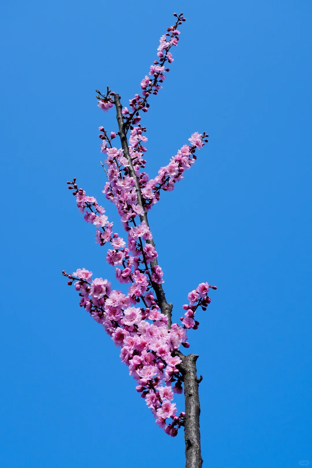 抬头是澄澈蓝天映衬着缀满繁花的枝桠,粉白相间的美人梅肆意绽放,层层叠叠,温柔又灵动;