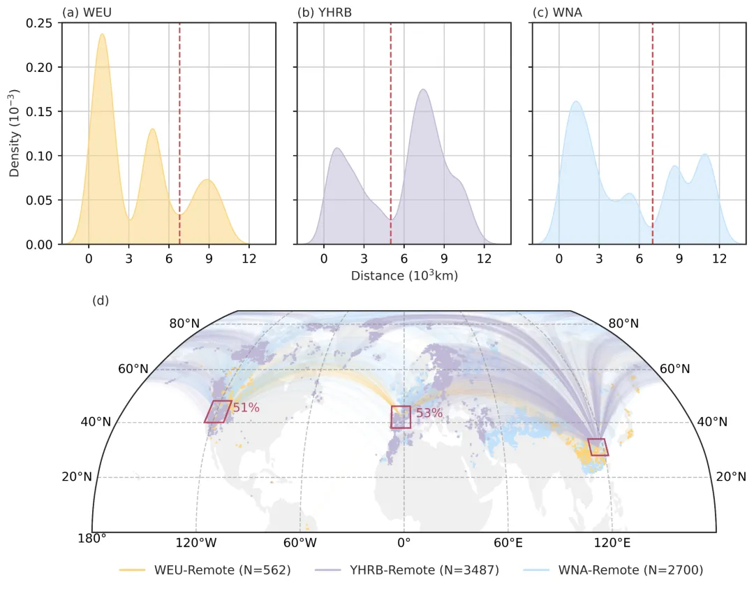 研究结果表明,北半球存在显著的多地同步极端高温的热点区域,主要包括西欧(WEU)、北美西部(WNA)以及江淮流域(YHRB)(图1)。这些地区之间存在显著的远距离联系,表明极端高温并非局地孤立事件,这可能受到大尺度环流系统的共同作用。同时,1979年以来同步高温事件的强度和发生频率均呈显著增加趋势,多数事件集中出现在过去二十年。
