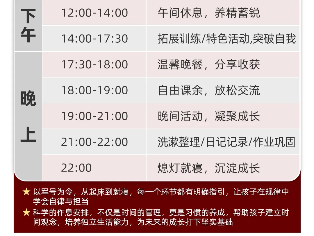 住宿安排:8-10人间,配备独立卫生间,空调,配套被褥床单枕头、衣架脸盆、学习课桌