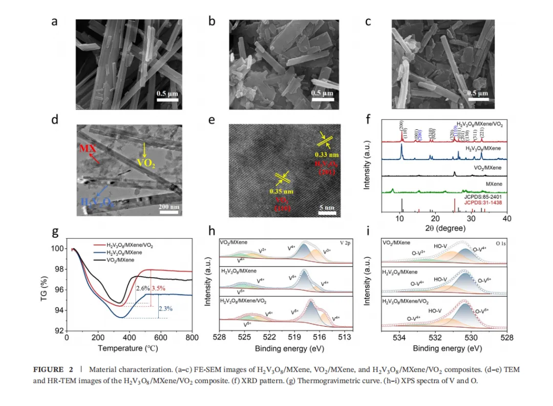 VO₂/MXene的制备:将0.03 g Ti₃C₂Tₓ MXene和0.24 mmol葡萄糖一水合物加入12 mL去离子水中,置于聚四氟乙烯内衬双室高压釜的一侧。然后,将2.4 mmol V₂O₅和12 mL去离子水置于双室高压反应器的另一侧。当温度升至240 °C时,通过旋转双室高压釜使两侧溶液充分混合,继续加热1 h。反应结束后通过真空抽滤获得产物,并在80 °C真空干燥24 h后收集得到浅蓝色粉末样品VO₂/MXene。