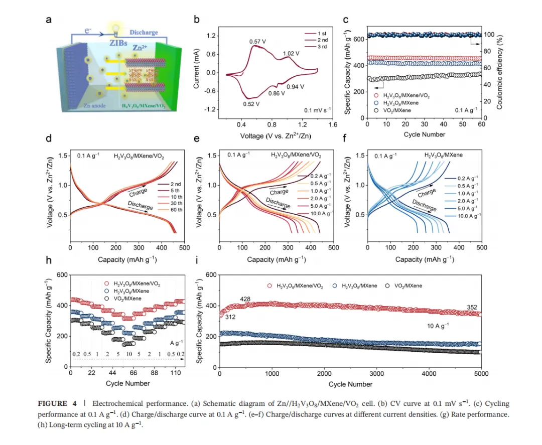 本文采用一步高温混合水热法合成了H₂V₃O₈/MXene/VO₂复合材料。两种组分H₂V₃O₈/MXene和VO₂/MXene在充放电过程中表现出相反的体积变化,它们的集成使复合电极在0.1 A g⁻¹电流密度下实现了457 mAh g⁻¹的放电比容量。