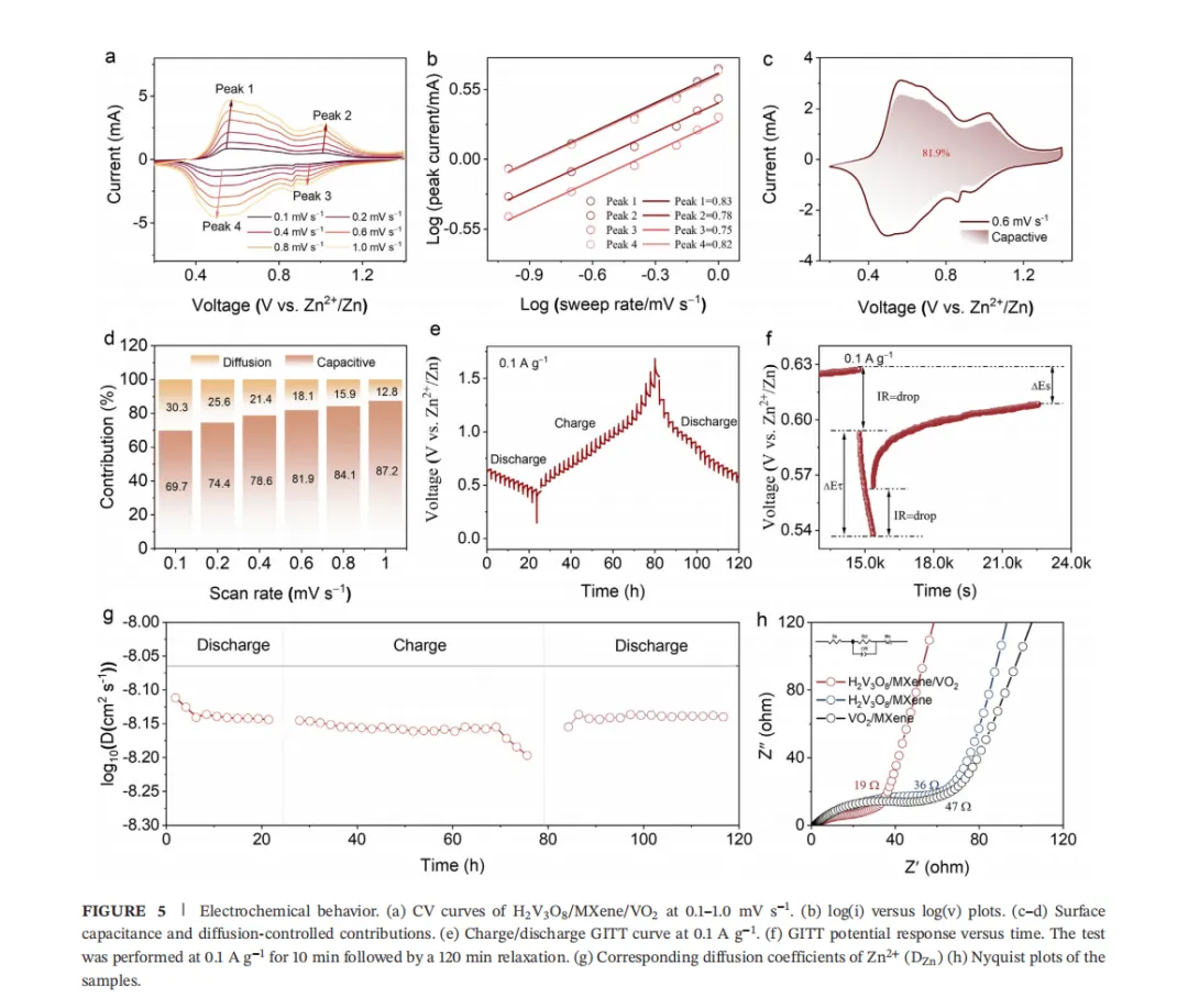 (3)具体而言,MXene作为正极材料的固有容量、其增强导电性的能力以及缓解体积变化的柔性层状结构也是不可或缺的。一步水热法还提高了材料纯度和结晶度,并促进了界面和孔结构的发展,从而增加了复合材料的比表面积。因此,将具有相反体积变化的电极材料进行集成,为提高水系锌离子电池(AZIBs)的比容量和稳定性提供了一种有效途径。