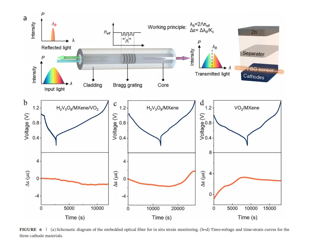 水系锌离子电池因其本征安全性和低成本而在电化学储能领域受到广泛关注。然而,Zn²⁺嵌入/脱出过程中的显著体积变化仍然是限制其应用的主要障碍。受通过结合具有相反热膨胀系数的材料实现近零热膨胀的启发,我们将两种在循环过程中表现出相反体积变化的材料进行复合,以在电池系统内实现体积中和效应。原位X射线衍射证实了H₂V₃O₈/Ti₃C₂Tₓ MXene/VO₂复合材料的稳定体积行为。该复合电极展现出优异的电化学性能,包括在0.1 A g⁻¹下457 mAh g⁻¹的放电比容量、10 A g⁻¹下最大容量达428 mAh g⁻¹的快充快放能力,以及10 A g⁻¹下循环5000次后仍保持352 mAh g⁻¹的长期稳定性。关键的是,通过嵌入式光纤传感器进行的实时应变监测直接记录了循环过程中的近零宏观体积变化,验证了协同中和设计的有效性。这些结果表明,体积中和策略是缓解结构降解的有力材料设计原则。这项工作为开发高性能、结构稳定的长寿命水系锌离子电池正极提供了新途径。