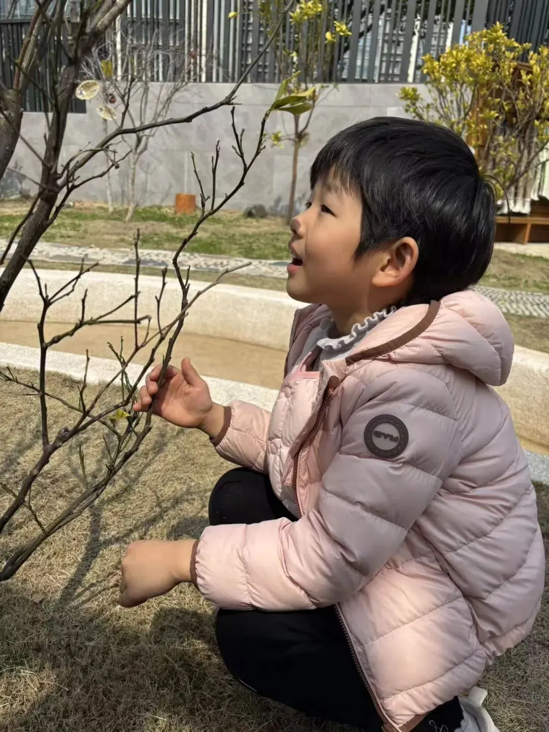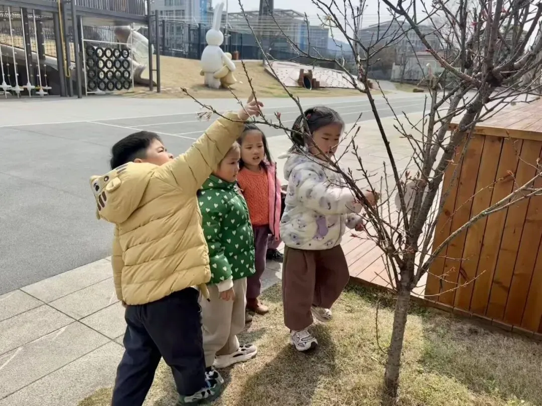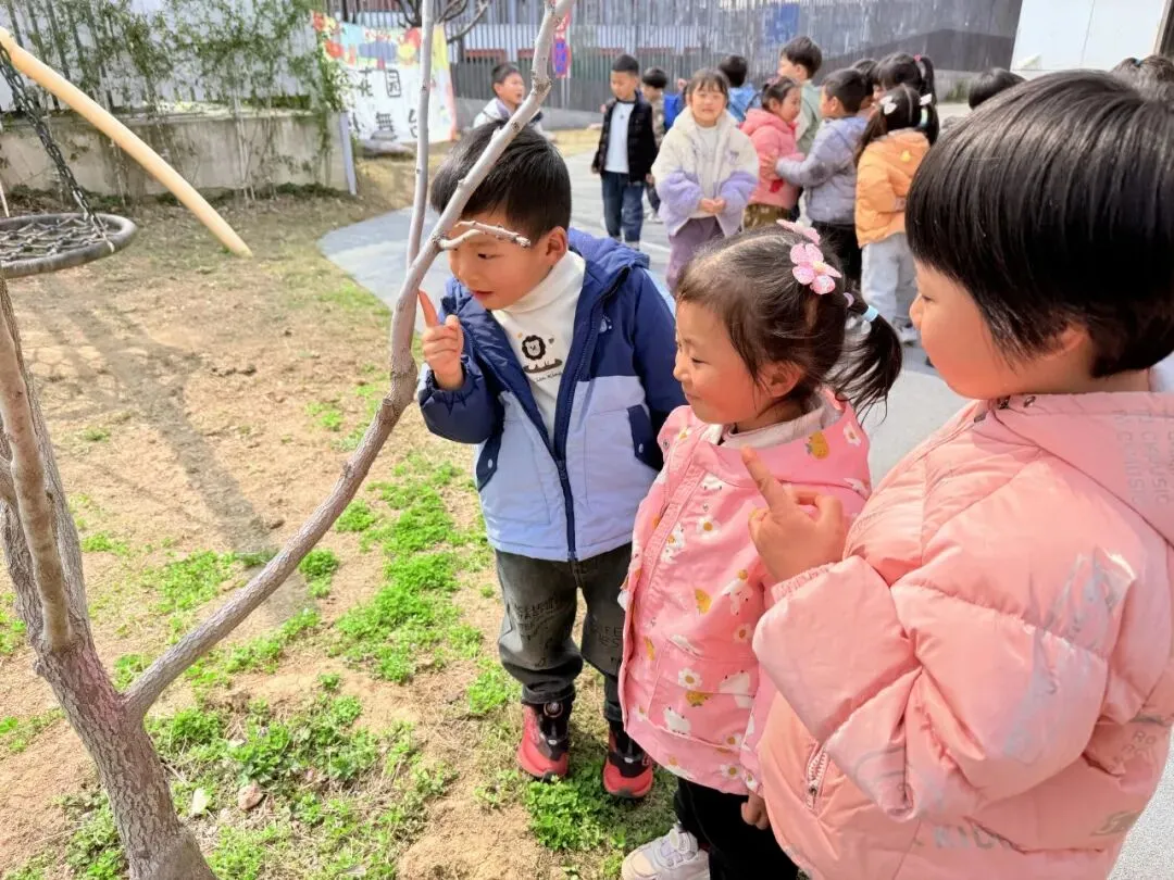 孩子们在午餐后散步时发现幼儿园里的树朋友有了新的变化: