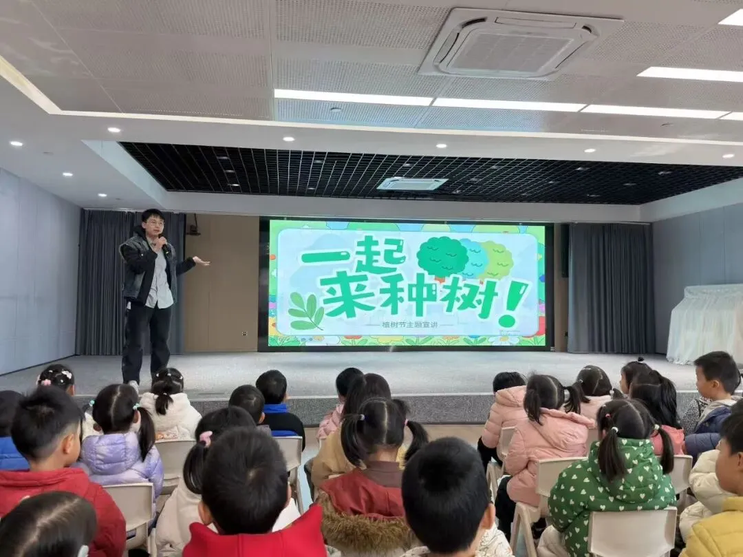 2026年3月12日上午,活动从三楼大礼堂的“种树小课堂”拉开序幕。王老师向孩子们介绍:“植树节是每年3月12日,这一天大家会一起种树,用行动保护地球妈妈……