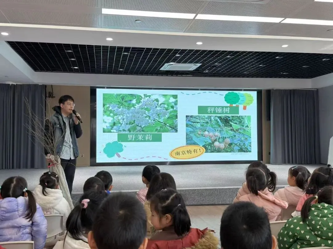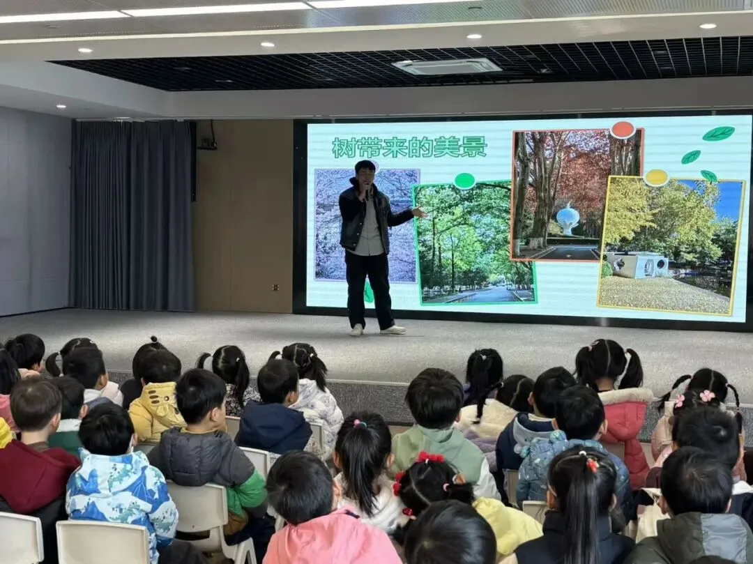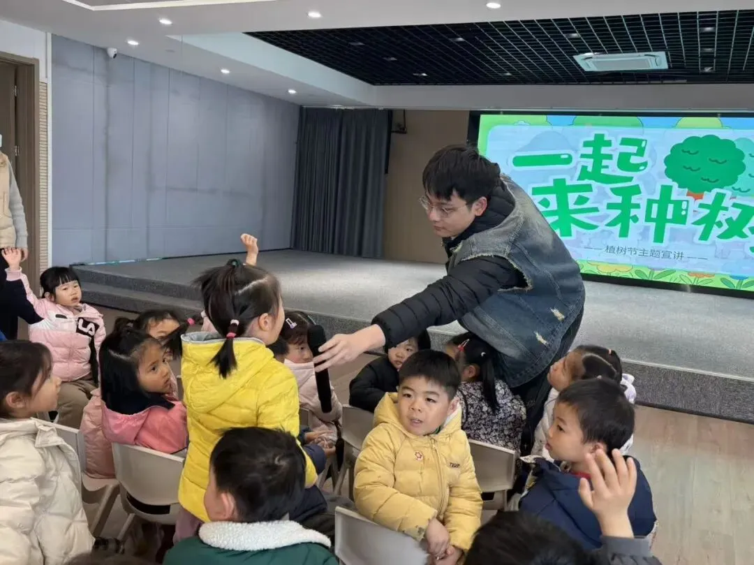 南林大的志愿者哥哥通过“树木与我们生活的关系”的问题调查,让小朋友们感受到我们的生活与树木有着紧密的联系。哥哥细致讲解了挖坑、扶正、填土、浇水的植树步骤,并介绍了南林大一年四季中由不同的树木营造出的美景,他还热情地邀请孩子们前去参观游玩呢。