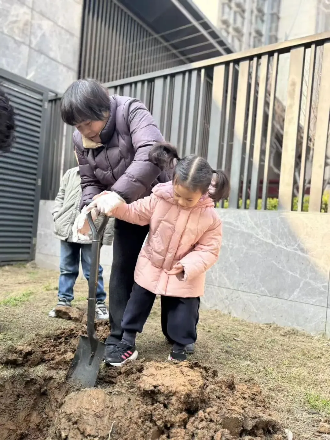 孩子们化身“小勘察员”,在幼儿园里穿梭勘察,你一言我一语地讨论着:“山坡上阳光充足,种在这里肯定能长得好!”“门卫室旁边有块空地,刚好能种树!”......经过一番热烈的讨论,大家最终选定了四个种植点。