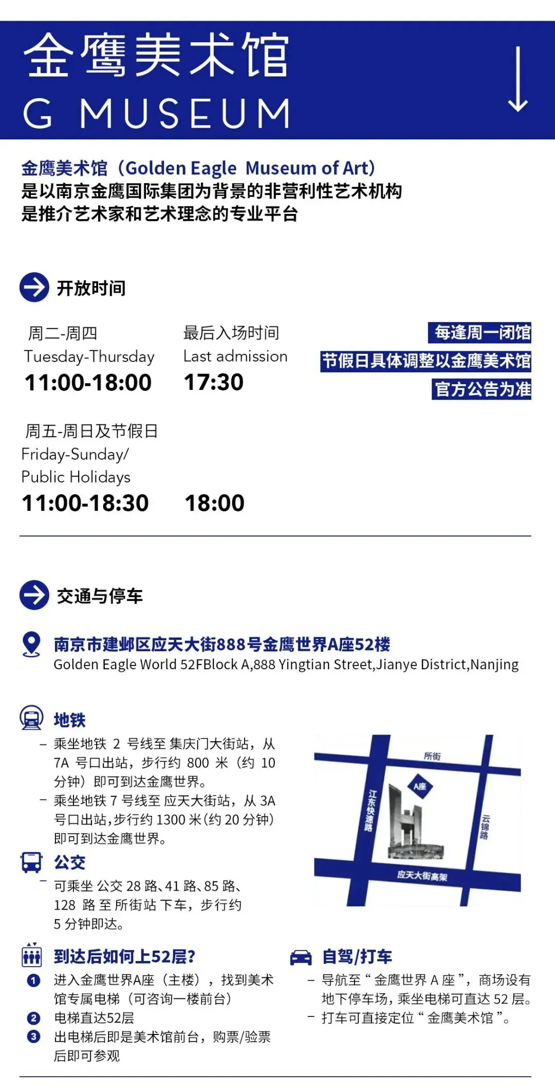 金鹰美术馆 位于南京新的主城区,坐落于河西地标性建筑——金鹰世界的52层整层,是南京艺术生态中重要的组成部分。金鹰美术馆是由金鹰国际集团创立的专业艺术机构,是一座空中的全艺术平台,涵盖了全球与艺术相关的艺术展览、艺术专题讲座、表演、工作坊、艺术教育、艺术商店、艺术书店等多样性的文化项目,每年呈现近百场。秉持着艺术与都市生态并行的理念,金鹰美术馆以美术馆为主体,不断尝试突破固有范畴和传统边界,积极介入到城市生活的各个领域,致力于成为一座兼具开放性、多元性、综合性的艺术体验中心,为公众提供与艺术互动的机会,延续城市与艺术之间的积极对话。