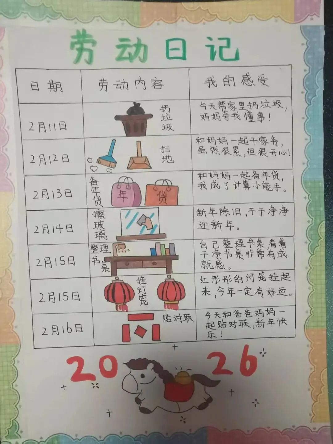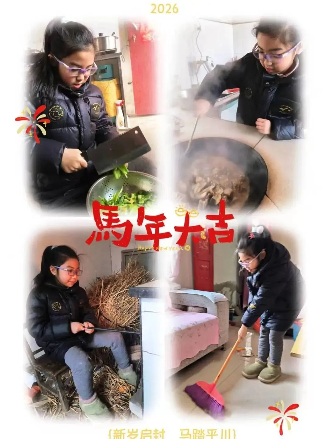 同学们积极参与吃苦耐劳的“勤劳马”活动,在劳动中体验年味、锤炼本领。在家中,他们是除尘迎福的小能手:整理房间、擦拭门窗、清洁厨房,让家焕然一新。他们是年味帮手:协助家人洗菜择菜、包饺子、分装年货,品味“年味”的温馨。他们还是暖心传情的小使者:给长辈捶背、递茶,传递孝亲美德。走出家门,大家又化身为社区志愿者,为独居老人送温暖,参与新春卫生志愿服务,用行动诠释勤劳与善良。