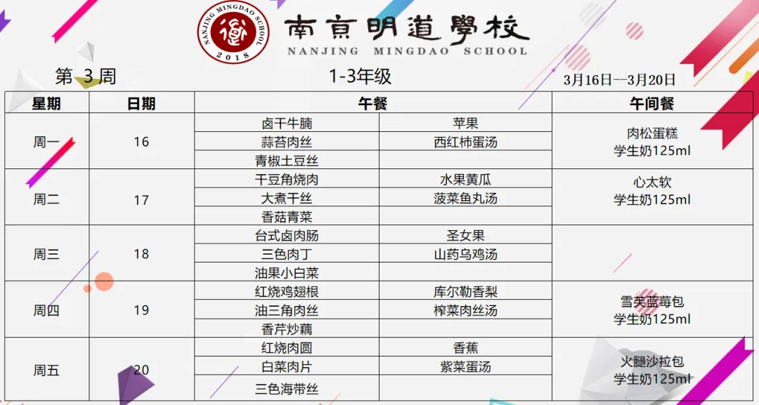 >南京明道学校第3周菜谱【1-3年级】20260316-20260320