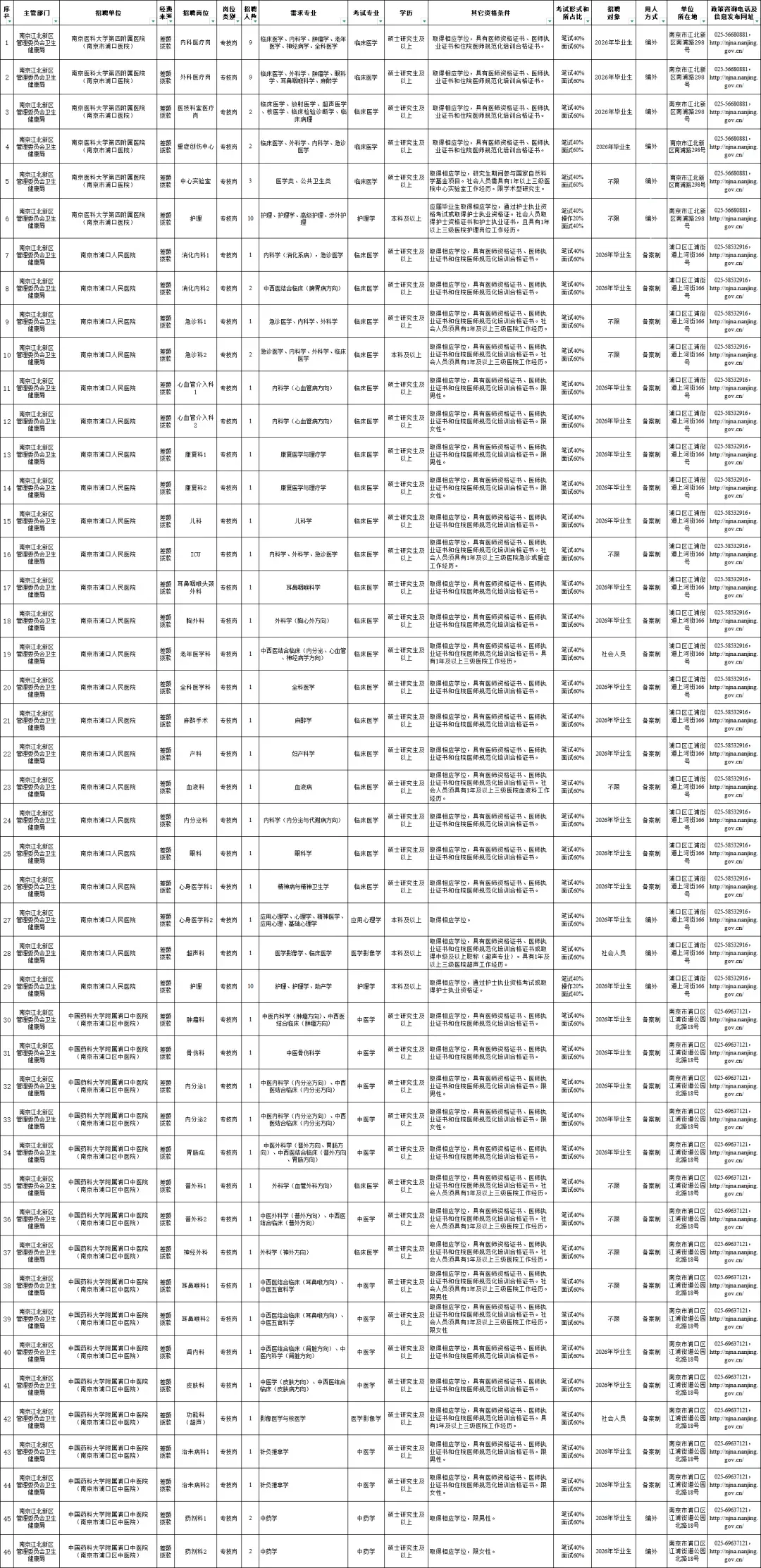 本次招聘相关信息在南京江北新区管理委员会网上发布。具体的招聘岗位、数量、资格条件等详见附件《南京江北新区管理委员会卫生健康局所属部分事业单位2026年3月公开招聘卫技人员岗位信息表》(以下简称《岗位信息表》,见文末)。