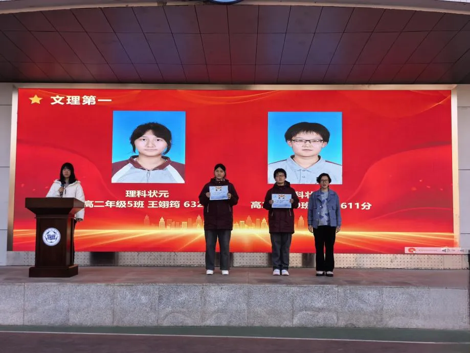 大会首先以“优秀学生表彰”拉开帷幕。在上学期的期末考试中,荣获理科状元与文科状元的分别是高二(5)班王翊筠同学与高二(9)班王希同学。刘婷组长为两位登顶者颁奖,高二同学掌声雷动,共同见证这份无数个日夜沉淀的结晶。