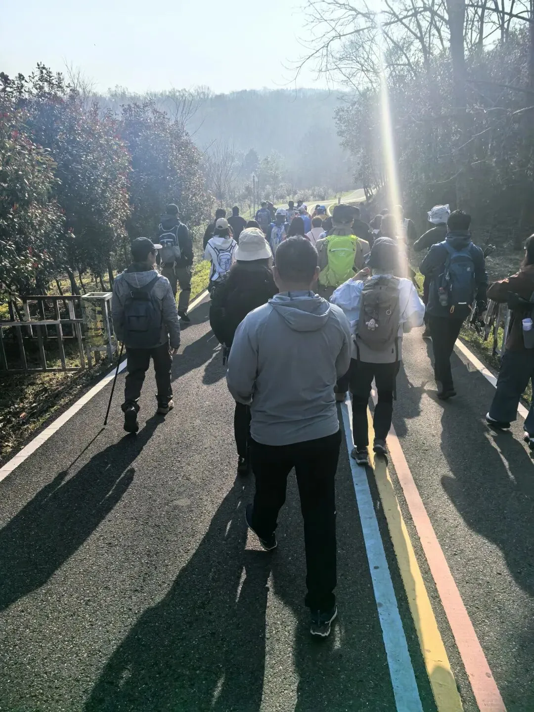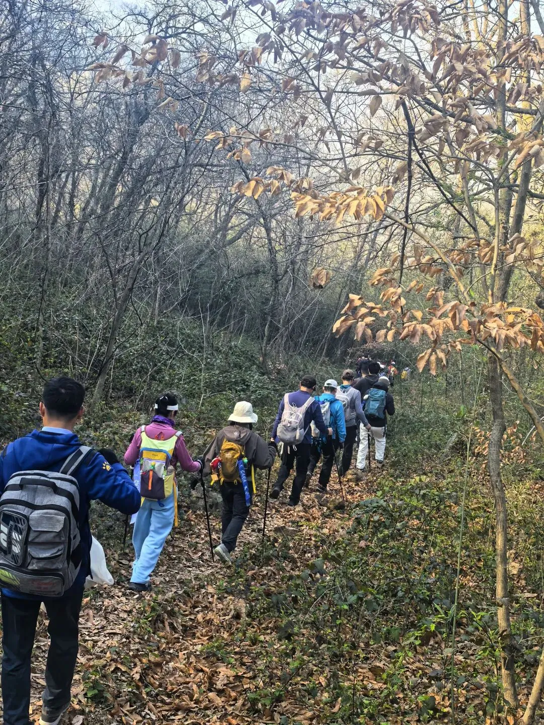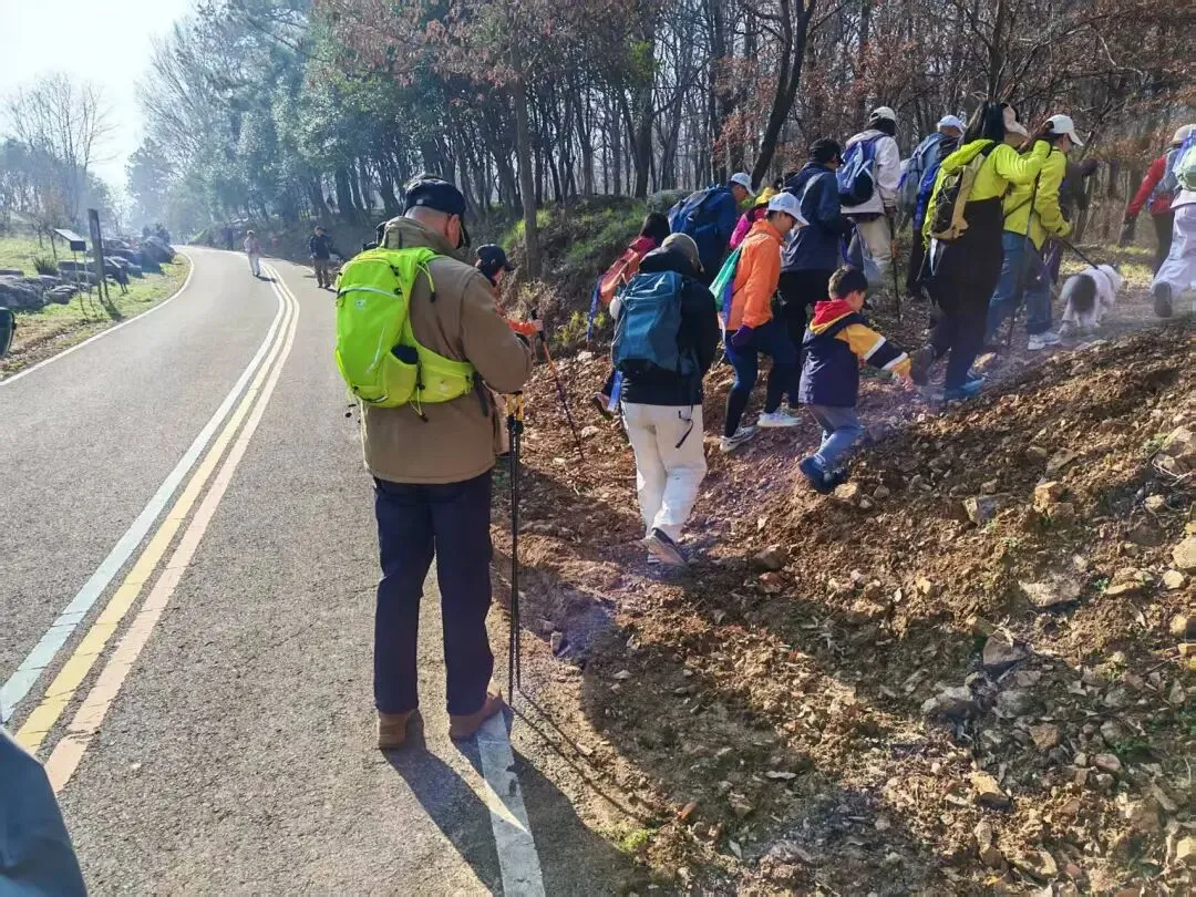 集合在东泉路和下余冲路路口,行走线路是:大女儿山、落叶路、匪集场、大观音洞、大马腰、小马腰AB线、大灰山西侧、汤泉紫叶李大道。