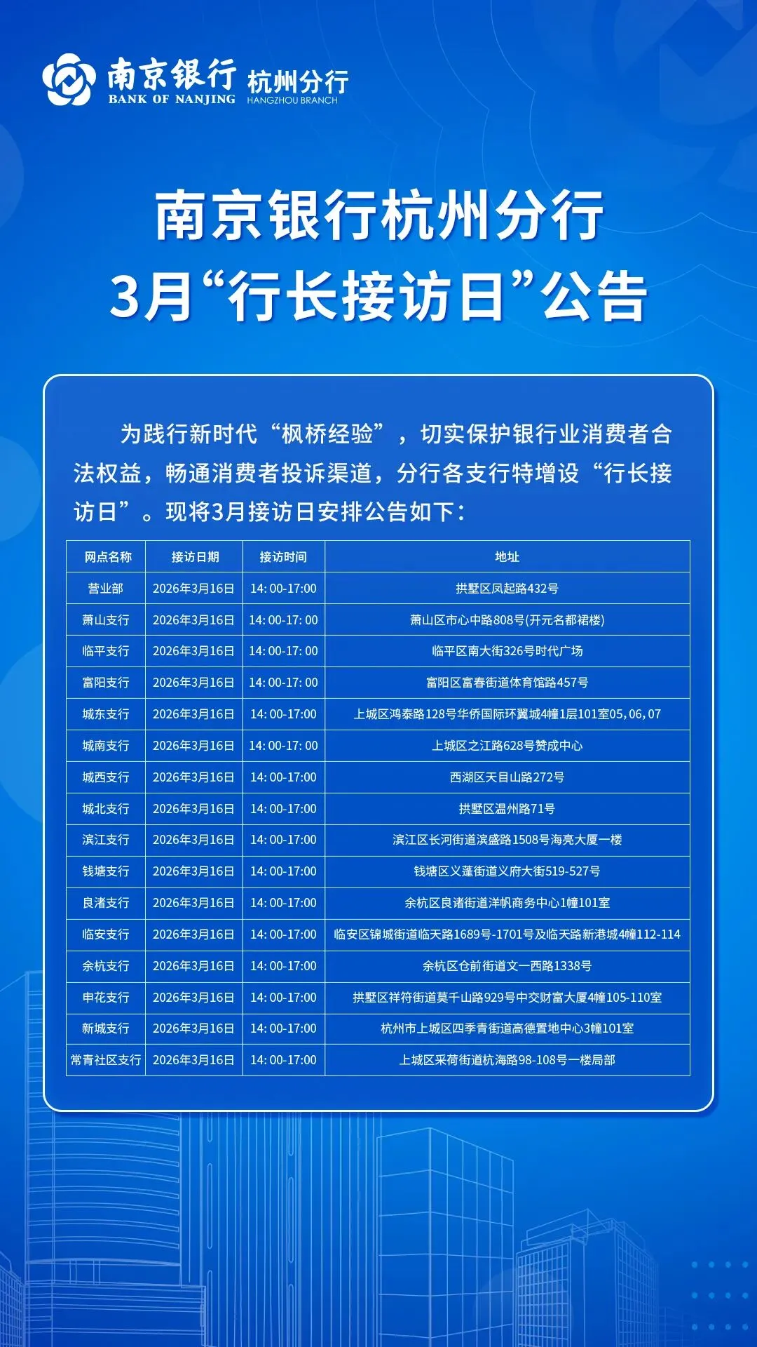 >【公告】南京银行杭州分行3月“行长接访日”公告