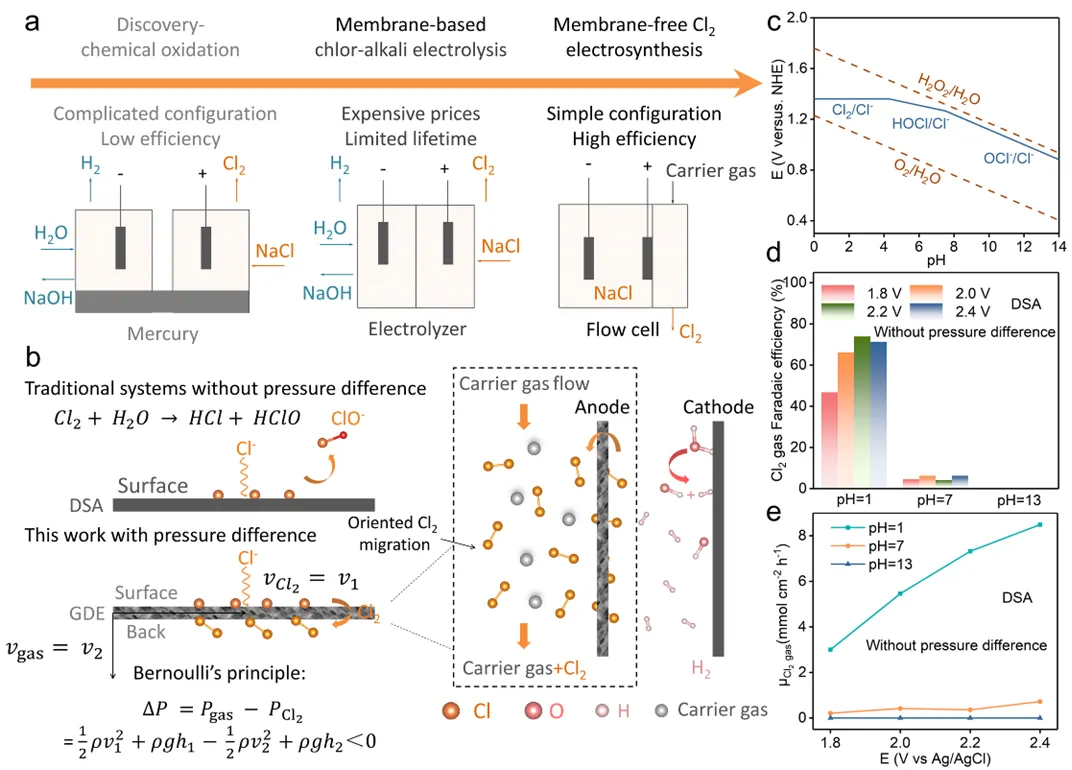 本研究开发了一种高效且经济的氯气(Cl₂)电化学合成体系。机制研究表明,采用基于三相伯努利原理的气体扩散电极设计,通过将氯气从生成位点移除,可突破普尔贝图(Pourbaix diagram)的限制,并在宽pH范围内实现优异的氯气产率。基于此,本研究构建了可独立运行的无隔膜氯碱原型装置,其活性与稳定性优异,且长时间运行后性能衰减极小。该成果不仅为规模化氯气生产提供了新思路,更通过拓展传统反应调控维度,为电解水制氢、尿素电解及氨电解等多元体系的设计提供了普适性启示。