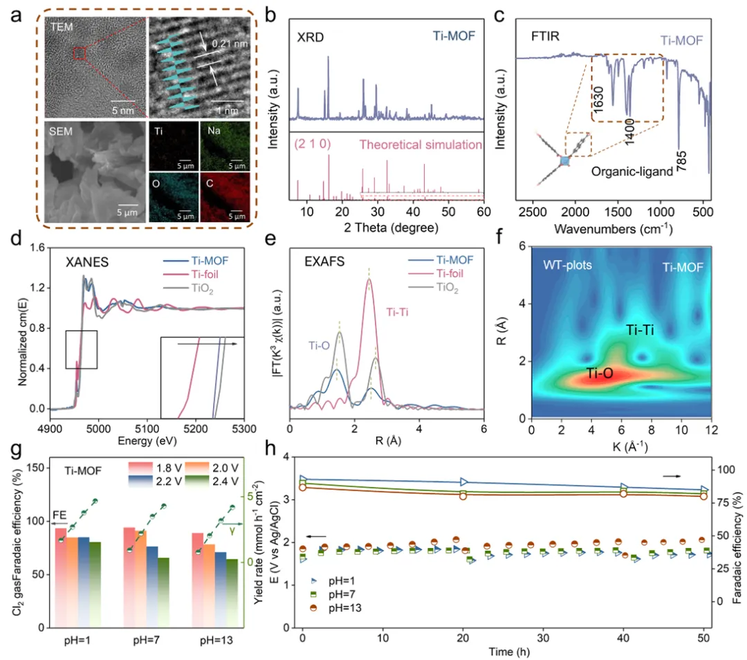 图 2 突破Pourbaix图限制的催化剂与体系设计。a,Ti-MOF催化剂的TEM及高分辨TEM图像;b,Ti-MOF的XRD图谱(25~60o区域放大10倍);c,FTIR光谱;d,Ti-MOF与参比样品(Ti箔、TiO2)的XANES光谱;e,EXAFS拟合曲线;f,WT-EXAFS图;g,不同pH下Ti-MOF的Cl2法拉第效率与产率;h,不同pH下的长期稳定性测试(100 mA cm−2)。
