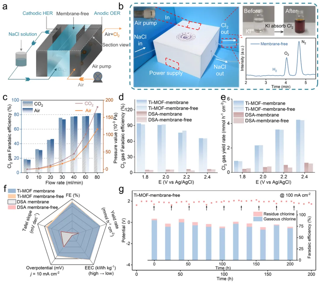 图 3 Cl2电合成原型装置。a,装置图;b,装置运行实物图(KI吸收Cl2变色及气相色谱验证);c,Cl2法拉第效率随载气流速变化;d-f,Ti-MOF与DSA在有膜/无膜体系中的法拉第效率、产率及性能对比(过电位、塔菲尔斜率、电耗);g,Ti-MOF无膜体系200小时稳定性测试(100 mA cm−2)。