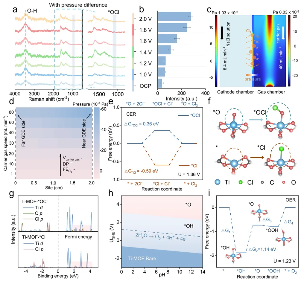 图 5 机制研究。a,原位拉曼光谱(不同电位下*OCl中间体信号);b,*OCl特征峰强度随电位变化;c-d,COMSOL模拟的压力分布及压力随流速变化;e-f,CER两种反应路径的DFT自由能图;g,Ti-MOF-*Cl 与Ti-MOF-*OCl的态密度(DOS);h,Ti-MOF的Pourbaix图(不同pH/电位下的表面吸附状态);i,OER副反应的自由能变化。