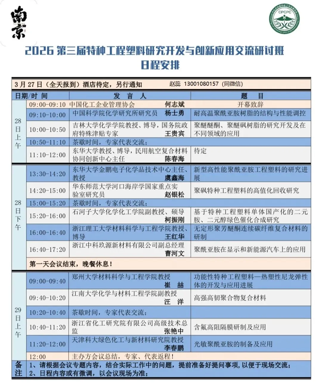 为促进特种工程塑料产业进步,让应用、改性、树脂、助剂、设备等产业链充分沟通互动,我单位将于2026年3月27日-29日在南京市举办“2026第三届特种工程塑料研究开发与创新应用交流研讨班”。会议将围绕特种工程塑料的创新应用、改性、新产品开发、高性能助剂、加工工艺及设备等主题进行探讨。届时将邀请业内资深专家到会演讲并进行专题交流,与全行业人士携手共同促进技术成果转化。诚邀全国高等院校、科研院所、企事业单位在特种工程塑料及相关领域工作的专家学者、科研人员、工程技术人员、管理人员等参会交流。现将有关事项通知如下: