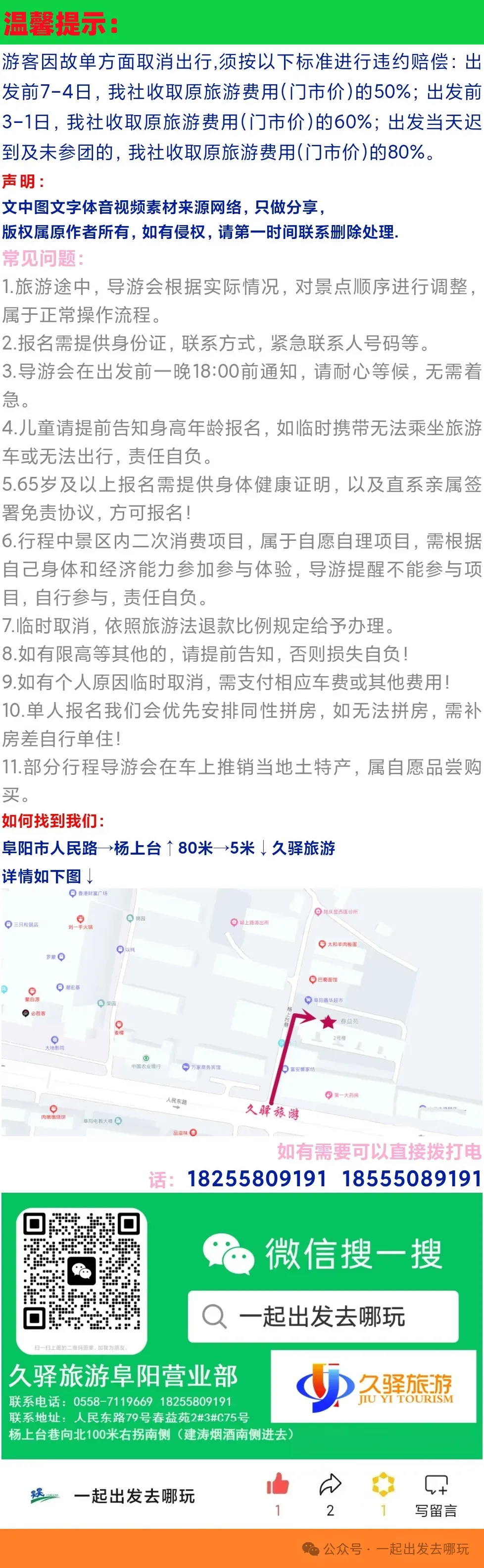 集合地点:阜阳体育场北门汽修厂内 (县城具体以导游通知时间为准)集合时间:早上6:40