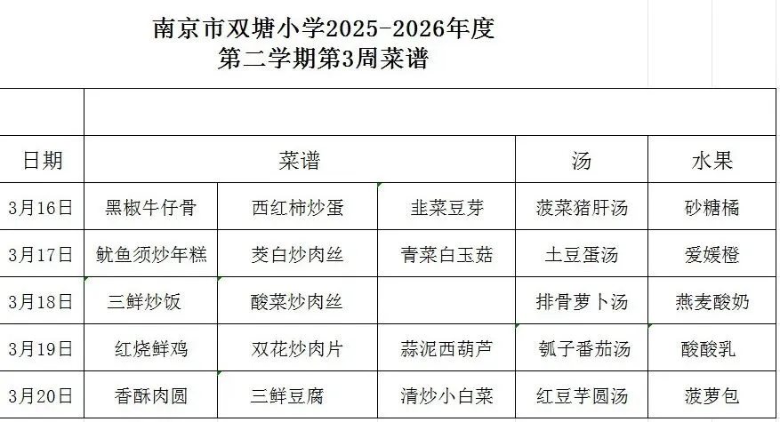 >南京市双塘小学2025-2026年度第二学期第3周菜谱