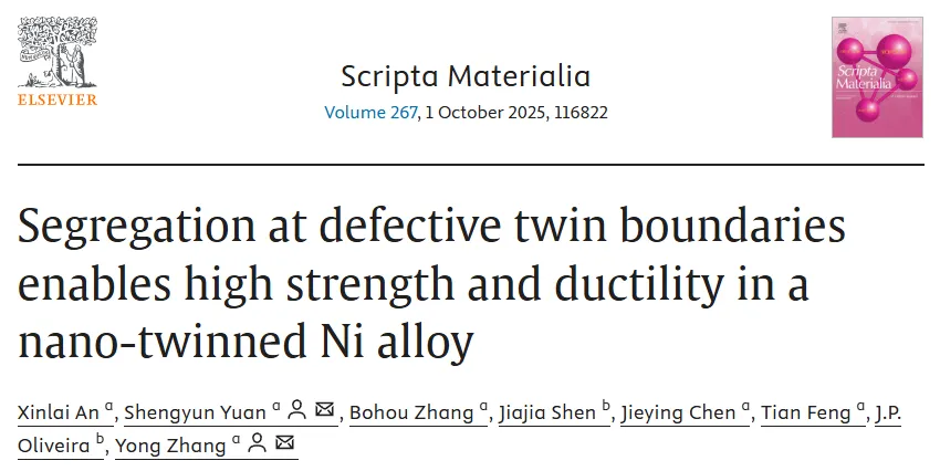 通过轧制与退火工艺,成功在纳米孪晶Ni合金中实现Cr元素在孪晶界台阶处的富集,并证实该偏析能够有效稳定孪晶界,抑制不全位错的过早滑移。