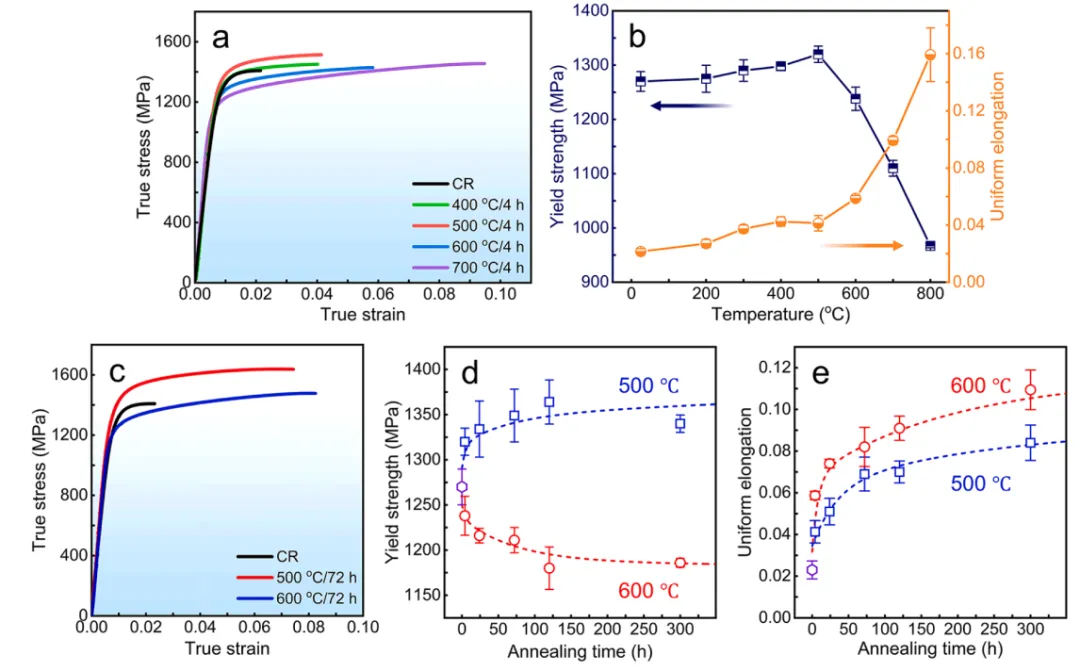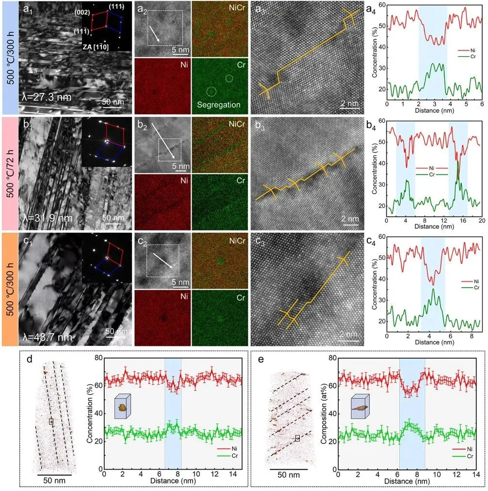 图1. 冷轧态样品的典型微观组织: (a) 纳米孪晶的明场TEM图像及插图SAED花样;(b) 孪晶/基体片层厚度统计分布;(c) 纳米孪晶的HAADF图像及对应各元素的EDS面分布图;(d) 图(c)局部放大显示孪晶界上的台阶;(e) 冷轧态样品各元素的三维重构图像。图2. (a) 冷轧态和不同温度退火4 h样品的应力-应变曲线。(b) 等时退火4 h过程中屈服强度和均匀延伸率的变化。(c) 冷轧态、500°C/72 h和600°C/72 h退火样品的应力-应变曲线。(d) 和(e) 分别为500°C和600°C退火时屈服强度和均匀延伸率随退火时间的变化。图3. 500°C退火24、72和300 h样品的典型微观组织: (a1-c1) 明场TEM图像及插图SAED花样;(a2-c2) 缺陷型纳米孪晶界的HAADF图像及对应的Ni、Cr EDS面分布图;(a3-c3) 图(a2-c2)局部放大显示孪晶界上的台阶;(a4-c4) 沿图(a2-c2)中箭头方向的一维浓度分布图。(d, e) 500°C退火24和72 h样品的APT重构图像及穿越Cr富集区的一维浓度分布图,等浓度面设置为32 at.% Cr。图4. 冷轧态和500°C/72 h退火样品的微观结构特征及微型拉伸工程应力-应变曲线: (a) 和 (b) CR-1和CRA-1样品的反极图、极图和累积取向差图,显示纳米孪晶的对称性。(c) 冷轧态和退火样品的微型拉伸应力-应变曲线,其中深色曲线对应图(a)和(b)中的样品。图5. (a) 冷轧态和500°C/72 h退火样品拉伸前后的SXRD图谱;(b) 计算得到的位错密度,CRT和CRAT分别指冷轧态和退火态样品拉伸后。(c) 500°C/72 h退火样品拉伸变形后纳米孪晶构型及Cr富集区的典型HAADF图像。(d) 沿图(c)中箭头方向的一维浓度分布图。5. 文章结论