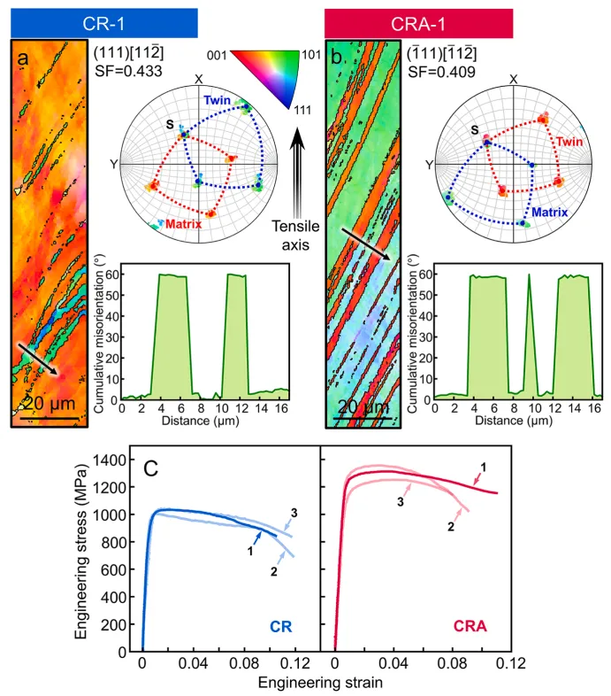 结合微型拉伸试验与EBSD分析,首次定量测定Cr富集使位错沿孪晶界滑移的临界分切应力提高约86 MPa,从力学角度证实了溶质偏析对孪晶界的钉扎效应。