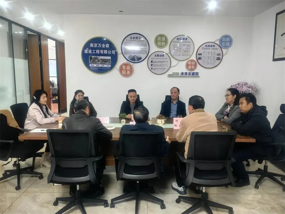 座谈伊始,马媒评首先感谢万全森公司的精心安排,并阐明此行旨在贴近企业、务实服务。南京万全森建设工程有限公司董事长王欲桂对商会一行表示热忱欢迎,并系统介绍企业发展历程。作为一家具备建筑工程施工总承包叁级资质的企业,万全森自2010年成立以来,始终恪守“发展实业、振兴企业”的初心,坚持“不骄不躁、严谨踏实”的作风。公司注册资本5000万元,现已成长为资产超千万元、职工百余人的稳健型企业,其中专业技术人员60余人,包括国家二级建造师8人、中高级职称人员20余人。凭借“质量第一、客户至上”的宗旨与“优质、高效、奉献”的服务准则,公司获评“质量信得过单位”,打造了士官学校、探伤房、水厂等多项精品工程。
