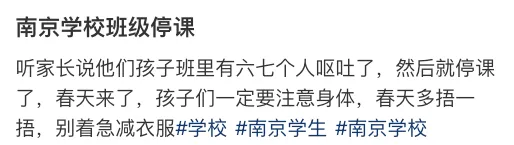 网友表示:听家长说他们孩子班里有六七个人呕吐了,然后就停课了,网友提醒:春天来了,孩子们一定要注意身体,春天多捂一捂,别着急减衣服。