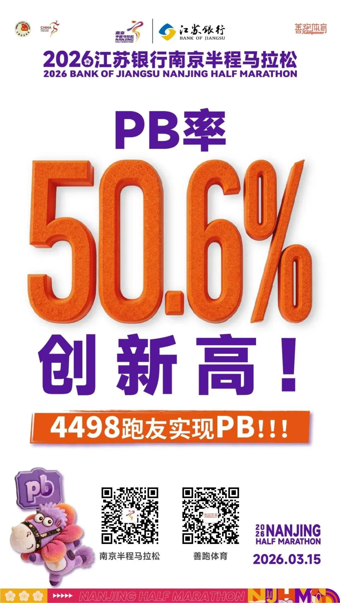 2026南京半程马拉松,总规模10000人,8888名选手起跑,8869人顺利完赛,完赛率99.8%。其中4498人刷新个人最好成绩,PB率高达50.6%。