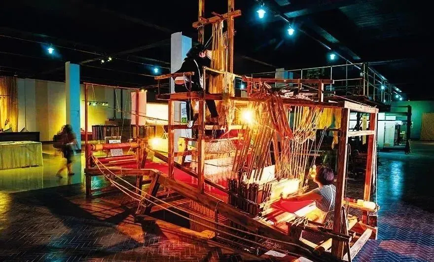 大花楼木织机织造云锦时,经丝与纬丝交织,由提花工和织造工用手工操作,具有不可替代性。