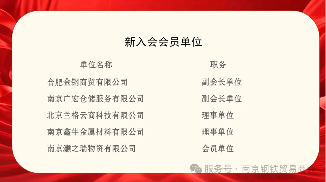 全体代表共同审议并完善商会 2026 年工作计划,积极为商会发展建言献策;审议通过五家新入会会员单位,分别为副会长单位合肥金钢商贸有限公司、南京广宏仓储服务有限公司;理事单位北京兰格云商科技有限公司、南京鑫牛金属材料有限公司;会员单位南京灏之瑞物资有限公司,新成员的加入为商会注入了新鲜血液,进一步壮大了商会队伍。