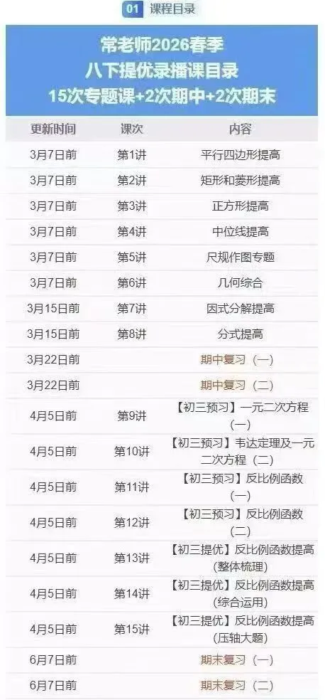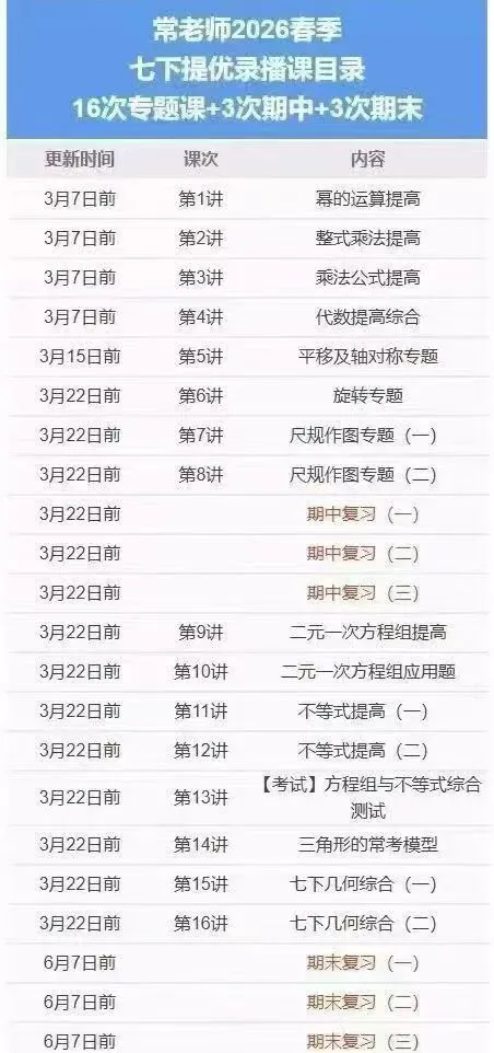 南京常老师数学|2026春季新课上线!七八九年级同步更新 📢 南京常老师数学 2026春季班 新课准时开更! 覆盖七、八、九年级全学段,春季核心内容当天同步更新,紧跟校内进度,夯实基础、专项拔高、冲刺提分一步到位! 紧跟常老师,数学稳步提升,春季学习不掉队~需要的同学/家长可及时联系!