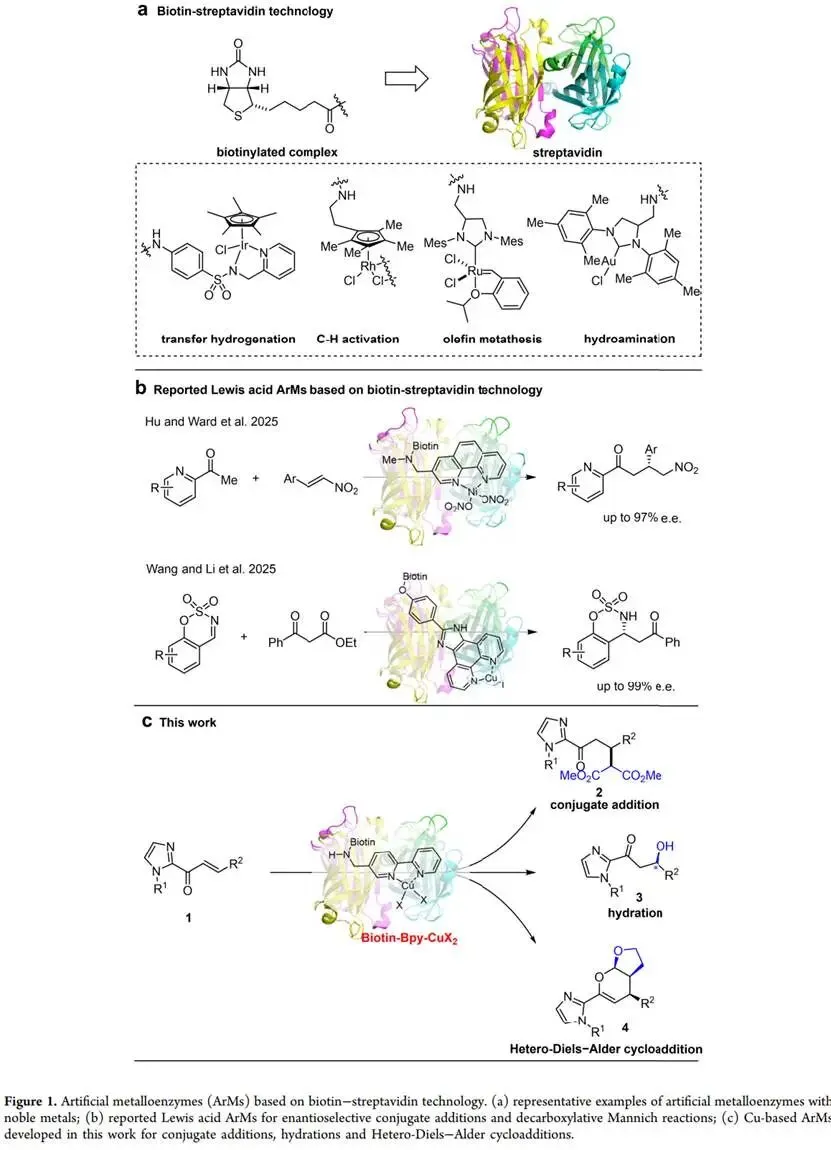 背景介绍:在可持续化学合成和生物经济发展的推动下,酶催化技术受到广泛关注。然而,天然酶的应用常受限于其狭窄的底物范围和有限的反应类型。人工金属酶(ArMs)通过将合成金属配合物嵌入蛋白质支架,有望结合过渡金属的反应活性和生物催化剂的立体选择性,从而突破天然酶的局限。在多种ArMs构建策略中,生物素-链霉亲和素(Biotin-Streptavidin, Sav)体系因其超强的结合亲和力(Kd≈ 10-14 M)成为构建活性位点的理想锚点,已被成功应用于多种反应。然而,目前主流的Sav-ArMs通常依赖于铱、铑、钌等贵金属和复杂配体,其多步合成路线限制了可持续性和可扩展性。相比之下,丰产、低成本的碱金属(如铜、铁、镍)更具优势。同时,碱金属是高效路易斯酸催化剂的核心,但天然酶体系中类似的催化功能有限,这为设计基于碱金属的新型路易斯酸人工金属酶带来了机遇。