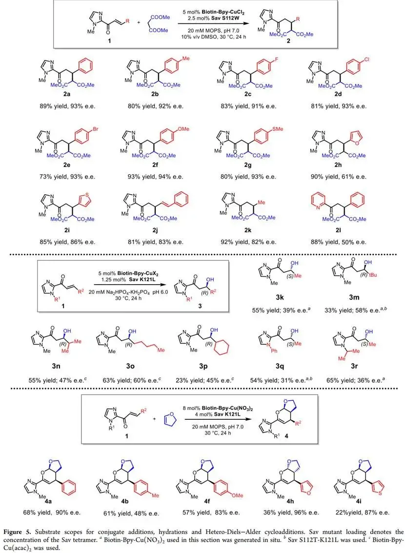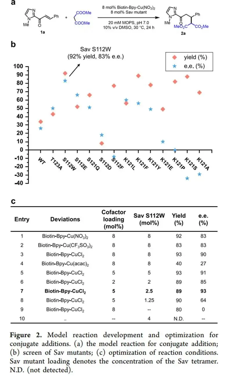 研究内容:研究首先成功组装了该人工金属酶体系,并以一个通用模型底物对上述三类反应进行了系统性优化。对于迈克尔共轭加成反应,通过对Sav蛋白关键氨基酸残基(S112和K121)进行定点突变,筛选出最优突变体S112W,将反应的对映选择性(e.e.值)从26%大幅提升至90%。研究还发现,反应性能高度依赖于金属盐和辅因子占据数,例如,使用CuCl2盐、且只有单个辅因子占据Sav蛋白二聚体结合口袋时,获得了最优的选择性。对于烯烃水合反应,突变体K121L表现出最佳效果。有趣的是,该反应与共轭加成不同,需要两个辅因子占据空腔才能获得最佳立体控制。对于杂狄尔斯-阿尔德环加成反应,通过条件优化,使用K121L突变体与Biotin-Bpy-Cu(NO3)2辅因子组合,实现了高达90%的对映选择性。