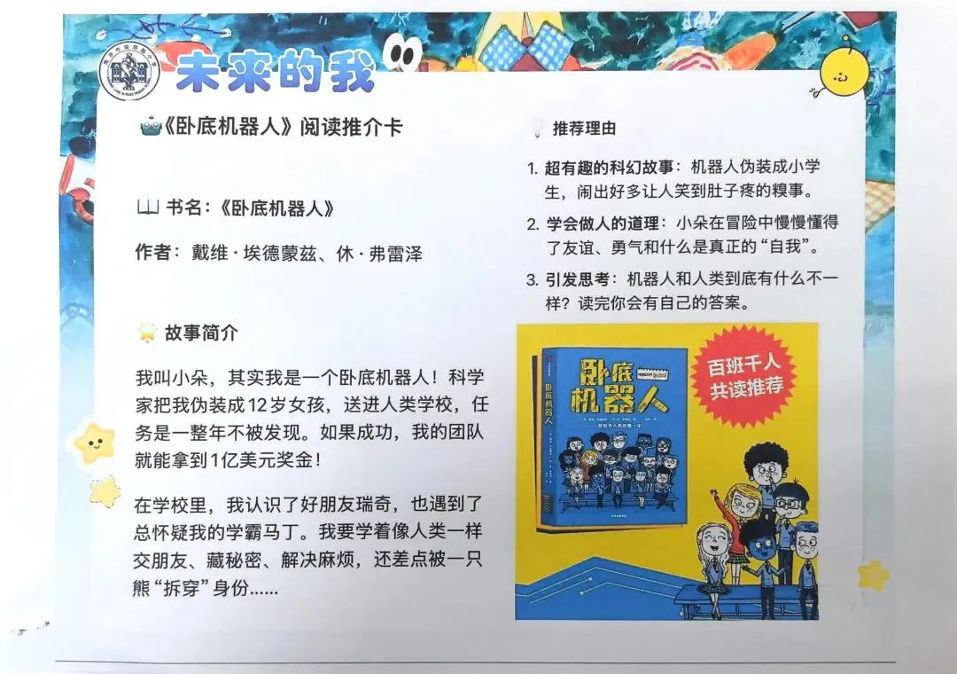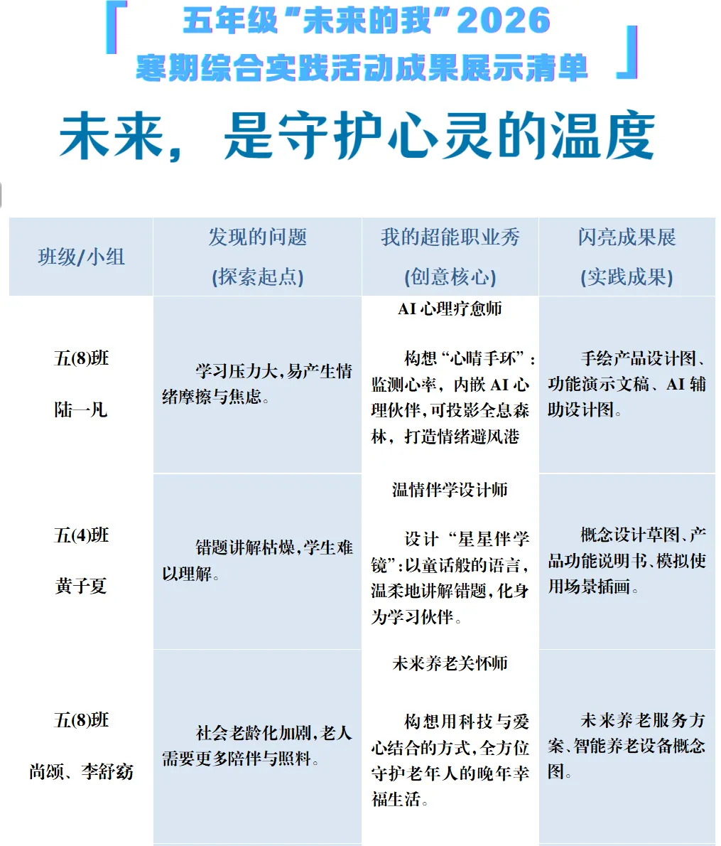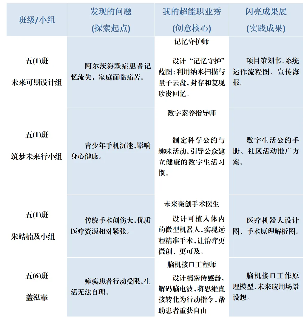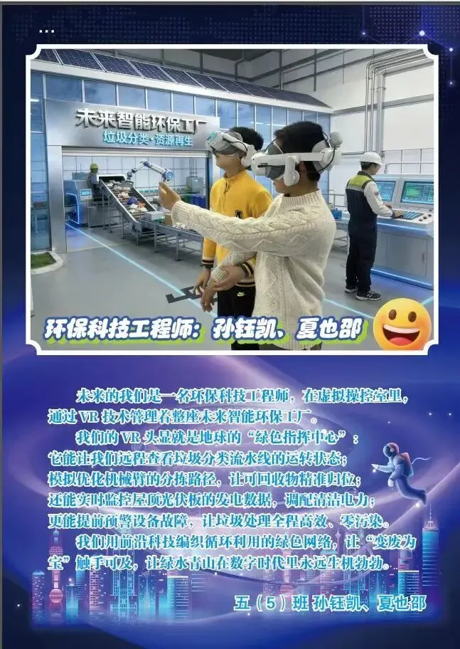 五(4)班黄子夏成为“温情伴学设计师”,打造能用童话语言讲解错题的“星星伴学镜”;五(6)班的傅钰瑶想成为“AI智能流浪动物园园长”,给流浪的小动物一个温暖的家;五(8)班尚颂和李舒窈同学则立志成为“未来养老关怀师”,用科技守护夕阳红。
