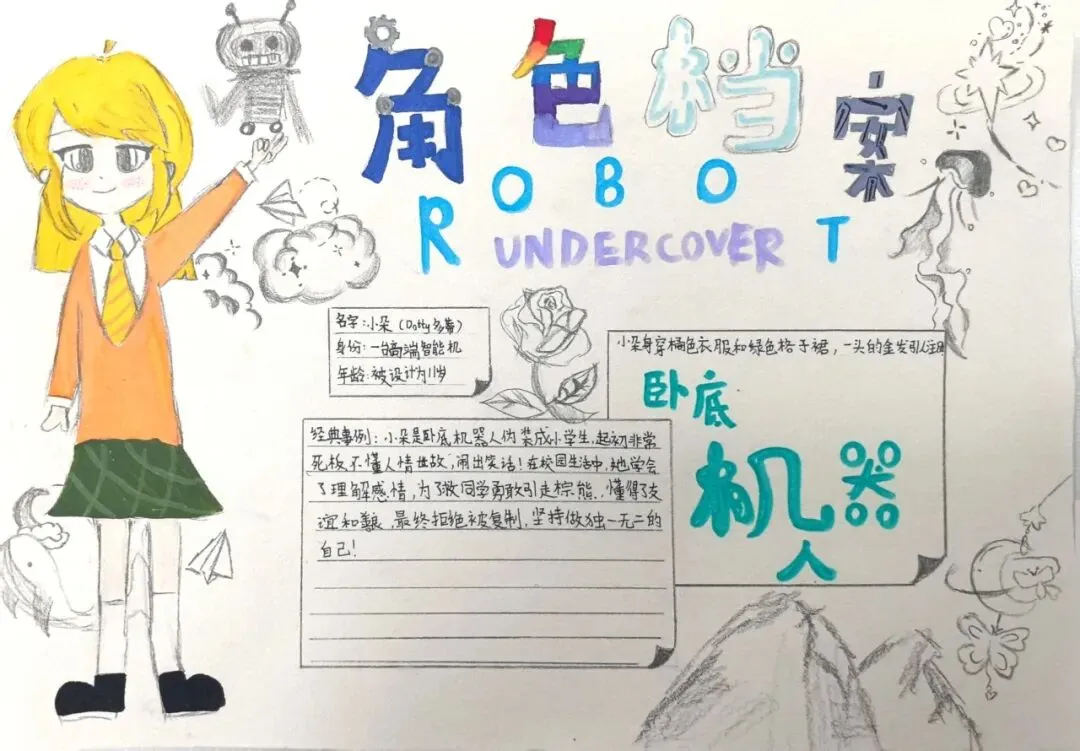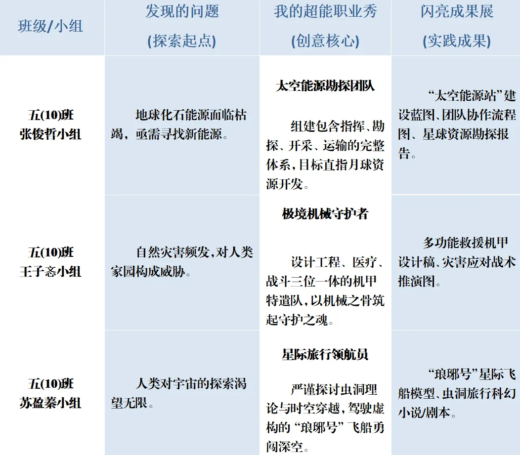 五(10)班王子忞小组则是"极境机械守护者",操控机甲特遣队抵御灾害。此外,还有"红色遗址数字医生"、"非遗数字传承人"…… 同学们打破学科壁垒,在科技与人文的交织中,完成了一次次精彩的职业角色设定与能力建构。