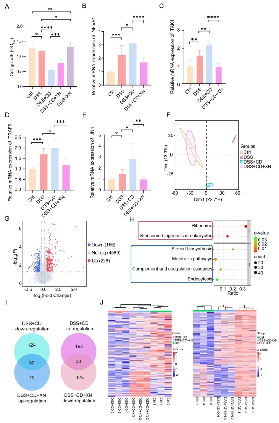 Fig1:验证艰难梭菌会加重 DSS 诱导的 Caco-2 细胞损伤,而黄腐酚可改善该损伤、抑制炎症通路激活;通过蛋白质组学证实 DSS 和艰难梭菌会显著改变 Caco-2 细胞蛋白质组,黄腐酚可逆转艰难梭菌引发的宿主蛋白表达异常,揭示其对宿主肠上皮的保护机制。