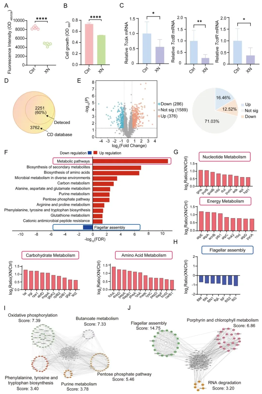 Fig2:证实黄腐酚能抑制艰难梭菌对 Caco-2 细胞的定植、增殖及毒素基因表达;蛋白质组学发现黄腐酚重塑艰难梭菌蛋白质组,影响碳代谢、氨基酸合成等通路,下调鞭毛组装相关蛋白,从蛋白质水平阐释黄腐酚对艰难梭菌毒力的抑制机制。