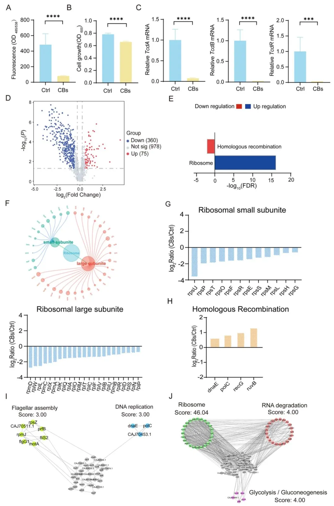 Fig3:证明丁酸梭菌上清与黄腐酚具有相似的抗艰难梭菌效果,可抑制其定植、生长和产毒;蛋白质组学显示其主要下调艰难梭菌核糖体相关蛋白、上调同源重组修复蛋白,且与黄腐酚共同调控鞭毛组装通路,提示二者存在共同的抗菌靶点。