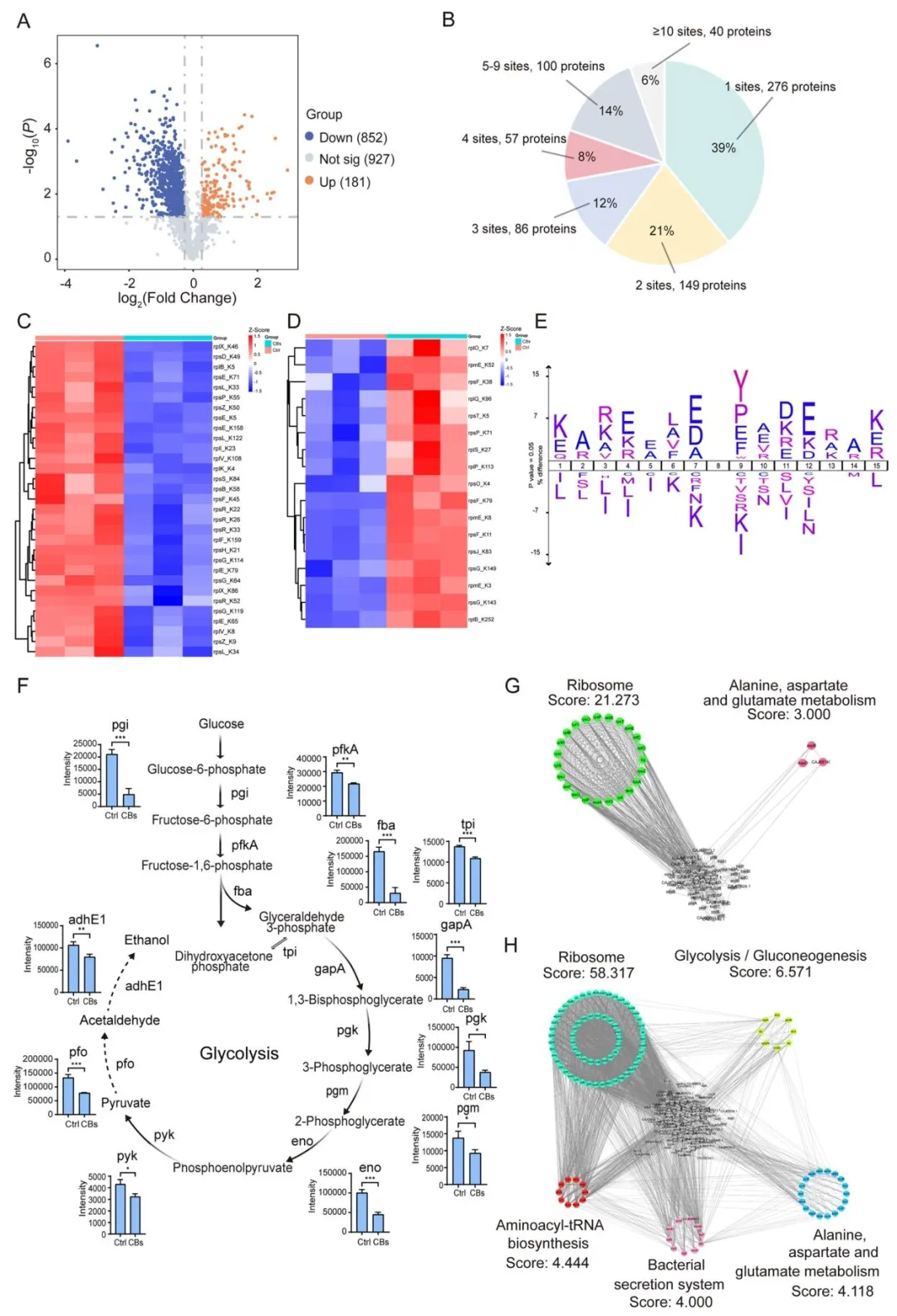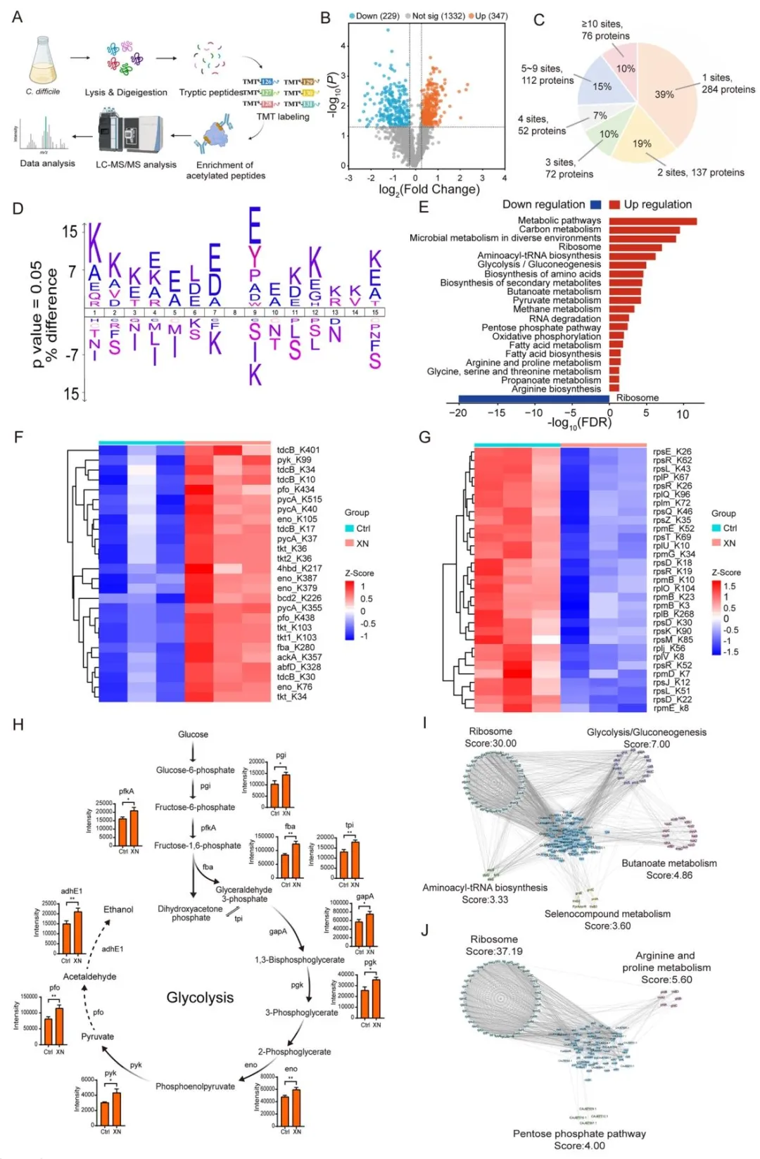 Fig4:通过乙酰化修饰组学解析黄腐酚对艰难梭菌赖氨酸乙酰化的调控特征,发现其广泛改变乙酰化位点,且乙酰化修饰主要富集于碳代谢、糖酵解等通路;证实黄腐酚可使糖酵解酶发生高乙酰化,揭示其通过乙酰化调控糖酵解的分子特征。