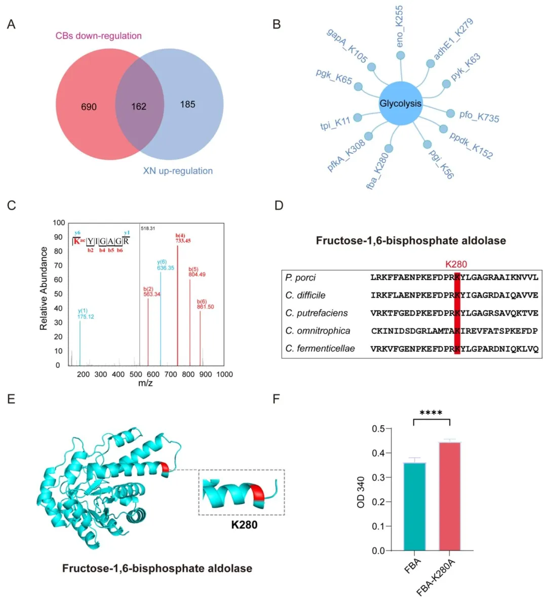 Fig6:筛选出黄腐酚和丁酸梭菌上清共同调控的糖酵解通路乙酰化蛋白,鉴定出 FBA 的 K280 为关键保守乙酰化位点;通过定点突变和酶活实验,证实 FBA K280 乙酰化对其催化活性至关重要,为二者抗艰难梭菌的核心靶点。