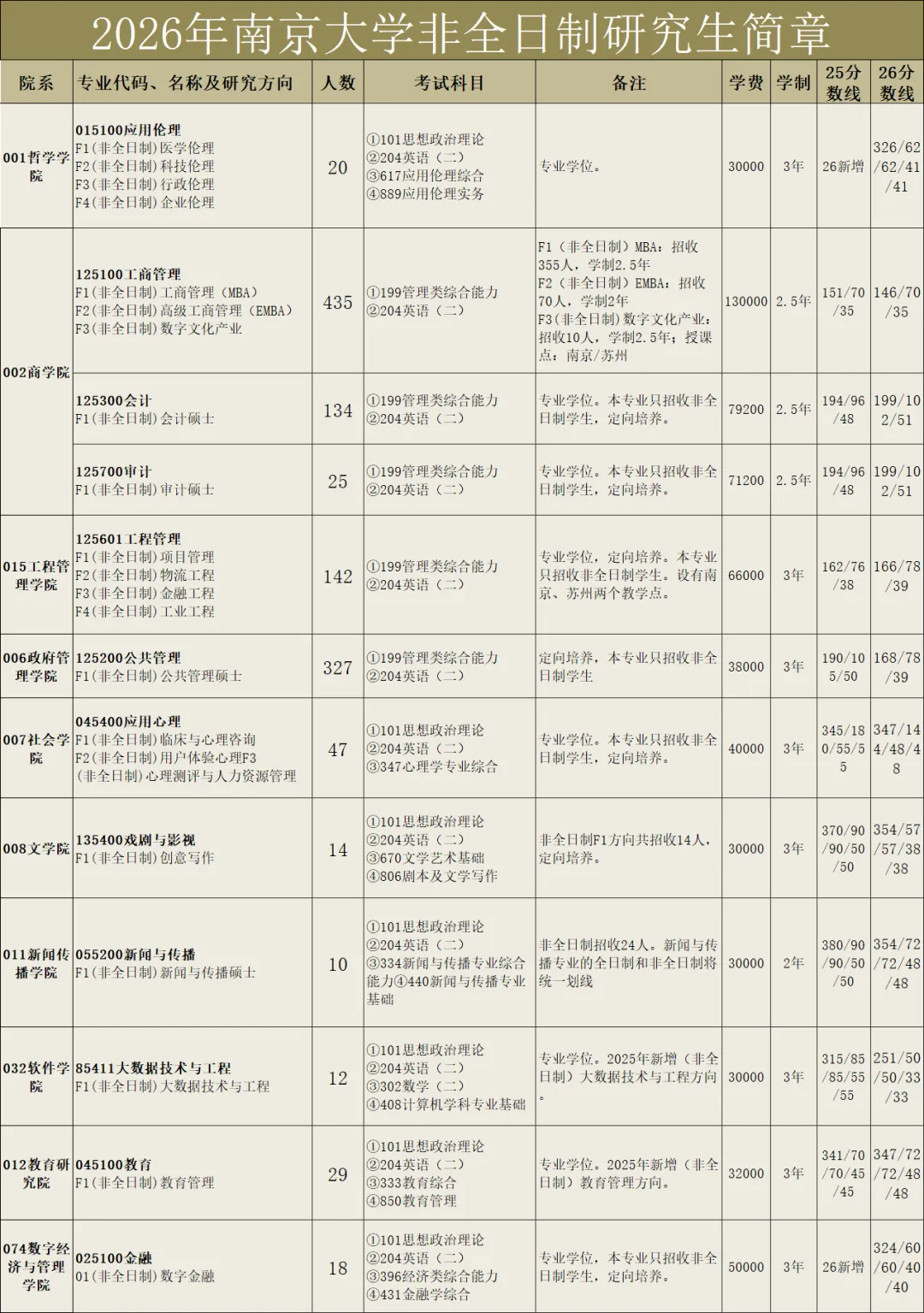 26南京大学非全日制研究生各专业历年分数线(含学费/学制/授课方式)