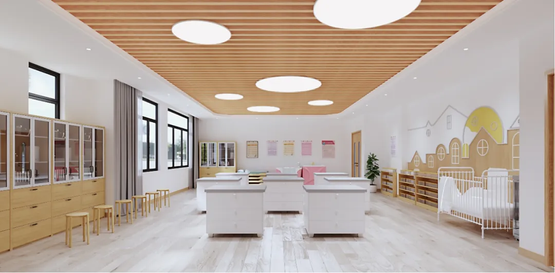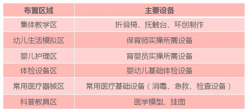 幼儿保育教育实训室围绕幼儿园一日保育活动,通过创设幼儿疾病预防与护理区、安全急救区、膳食营养区、幼儿健康保健区等活动区域,借助相应实训材料,配合国家职业技能鉴定《保育师》《育婴员》的技能考核,能满足对清洁消毒、生活管理、配合教育活动、安全工作等内容的实训要求。