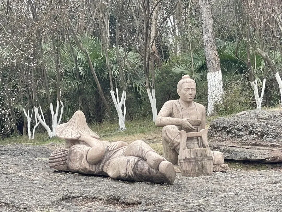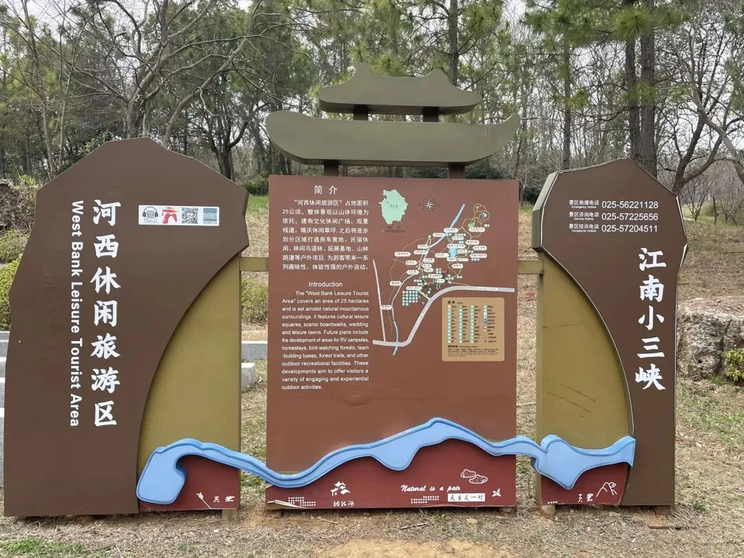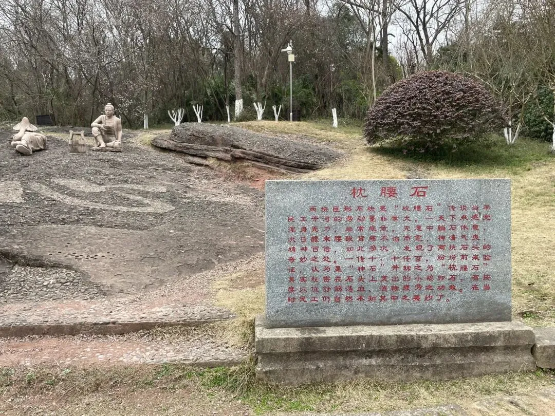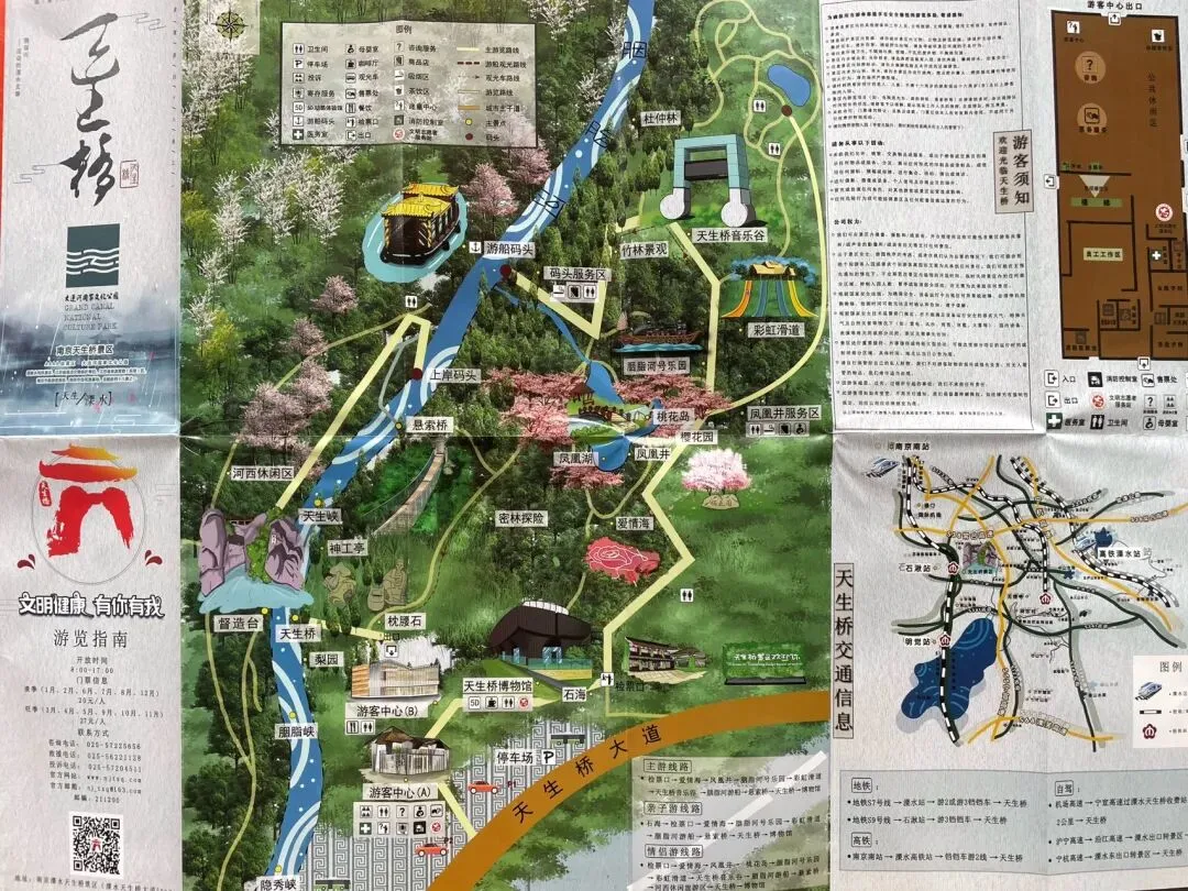 想当年,开凿胭脂河留下这座“虽为人作,宛如天成”的“天生桥”,确定担负起两岸往来交通功能;如今,一座钢筋混凝土结构的有栏杆的桥梁,安卧于本源“天生桥”之上。游客们驻足于层迭于石桥之上的新桥,将此作为观景平台,观赏着河道(古称“胭脂峡”;游客称其为“江南小三峡”)景象——上图为人工开凿的胭脂河崖壁上的石刻——“胭脂峡”三字赫然在目。这“枕腰石”的故事挺有趣:传说当年民工开河的劳动量非常大,一天下来感觉浑身无力,非常疲乏,无意中躺在石头上休息,次日醒来,腰酸背痛,不治而愈,神清气爽,精神百倍。在当时,民工们自然不知其中之奥妙了。如此多次,发现了两块石头的奇妙之处。一传十,十传百,纷纷前来验证,认为是“神石”并称之为“枕腰石”。其实秘密就在石头上突出的小鹅卵石,有按摩穴位、舒筋活血、消除疲劳之功效,在当时民工们自然不知其中只奥妙了。大致了解了天生桥景区的这些掌故,基本达到“文旅融合”的具身体悟目的,看到如下“河西休闲旅游区”的导游展版,发现此地好玩的地方挺多。鉴于还得去参观博物馆,就没能在此“休闲”了(如果天气好些,阳光明媚,可能会有于此发呆晒太阳的动机)。此外,在“天生桥”附近,胭脂河上,有人造景观“天生探险桥”,前往看一眼即告辞,即使有玩的兴趣和胆量,也不合年龄要求(门票30元,70岁以上谢绝入场)——天堑探险桥